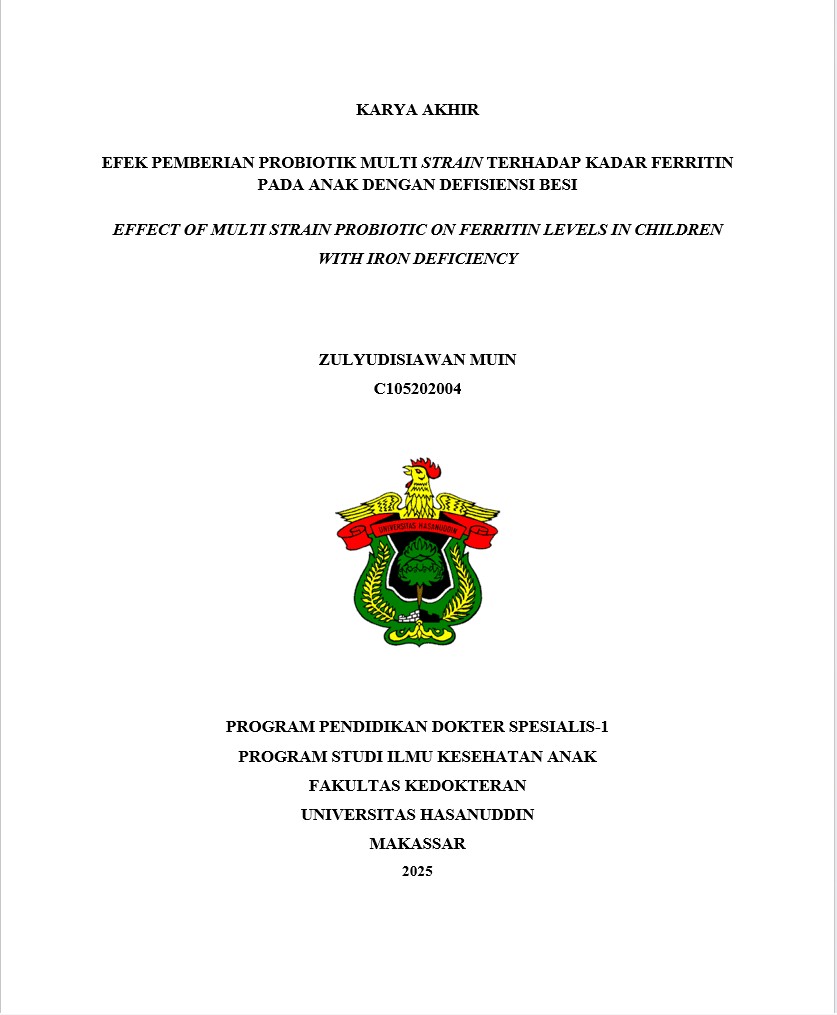 MUIN, ZULYUDISIAWAN (2025) EFEK PEMBERIAN PROBIOTIK MULTI STRAIN TERHADAP KADAR FERRITIN PADA ANAK DENGAN DEFISIENSI BESI = EFFECT OF MULTI STRAIN PROBIOTIC ON FERRITIN LEVELS IN CHILDREN WITH IRON DEFICIENCY. Skripsi thesis, Universitas Hasanuddin.