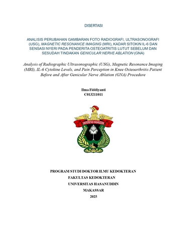 FIDDIYANTI, ILMA (2025) ANALISIS PERUBAHAN GAMBARAN FOTO RADIOGRAFI, ULTRASONOGRAFI (USG), MAGNETIC RESONANCE IMAGING (MRI), KADAR SITOKIN IL-6 DAN SENSASI NYERI PADA PENDERITA OSTEOATRITIS LUTUT SEBELUM DAN SESUDAH TINDAKAN GENICULAR NERVE ABLATION (GNA) = Analysis of Radiographic Ultrasonographic (USG), Magnetic Resonance Imaging (MRI), IL-6 Cytokine Levels, and Pain Perception in Knee Osteoarthritis Patient Before and After Genicular Nerve Ablation (GNA) Procedure. Disertasi thesis, Universitas Hasanuddin.