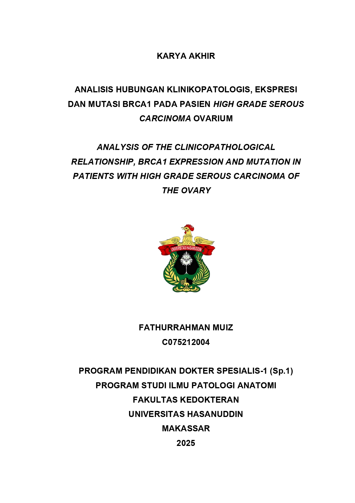 MUIZ, FATHURRAHMAN (2025) ANALISIS HUBUNGAN KLINIKOPATOLOGIS, EKSPRESI DAN MUTASI BRCA1 PADA PASIEN HIGH GRADE SEROUS CARCINOMA OVARIUM = ANALYSIS OF THE CLINICOPATHOLOGICAL RELATIONSHIP, BRCA1 EXPRESSION AND MUTATION IN PATIENTS WITH HIGH GRADE SEROUS CARCINOMA OF THE OVARY. Skripsi thesis, Universitas Hasanuddin.