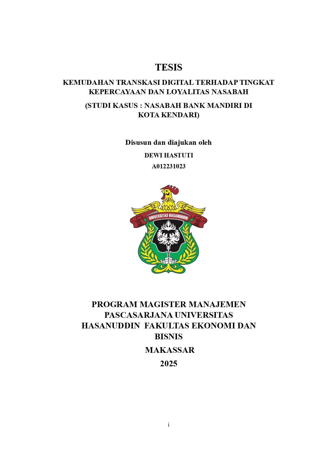 HASTUTI, DEWI (2025) Kemudahan Transkasi Digital Terhadap Tingkat Kepercayaan dan Loyalitas Nasabah : Studi Kasus : Nasabah Bank Mandiri Di Kota Kendari = The Effect Of Digital Transaction Convenience On Customer Trust And Loyalty. (Case Study: Bank Mandiri Customers In Kendari City). Thesis thesis, Universitas Hasanuddin.