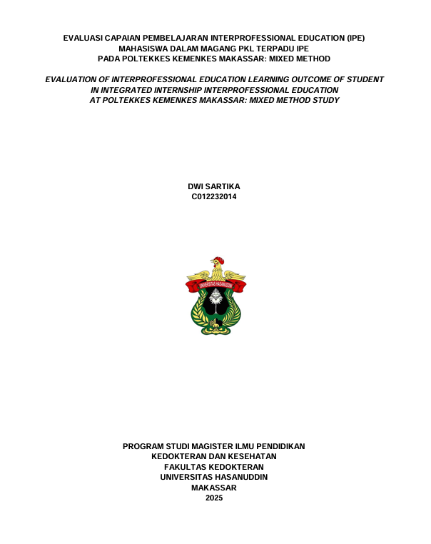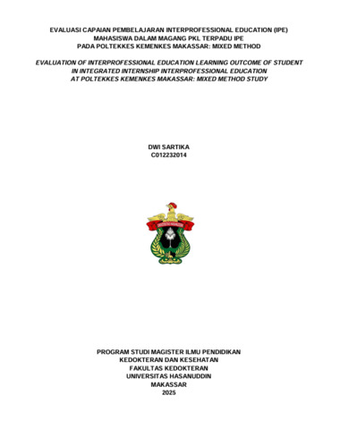 EVALUASI CAPAIAN PEMBELAJARAN INTERPROFESSIONAL EDUCATION (IPE) MAHASISWA DALAM MAGANG PKL TERPADU IPE PADA POLTEKKES KEMENKES MAKASSAR: MIXED METHOD = EVALUATION OF INTERPROFESSIONAL EDUCATION LEARNING OUTCOME OF STUDENT IN INTEGRATED INTERNSHIP INTERPROFESSIONAL EDUCATION AT POLTEKKES KEMENKES MAKASSAR: MIXED METHOD STUDY