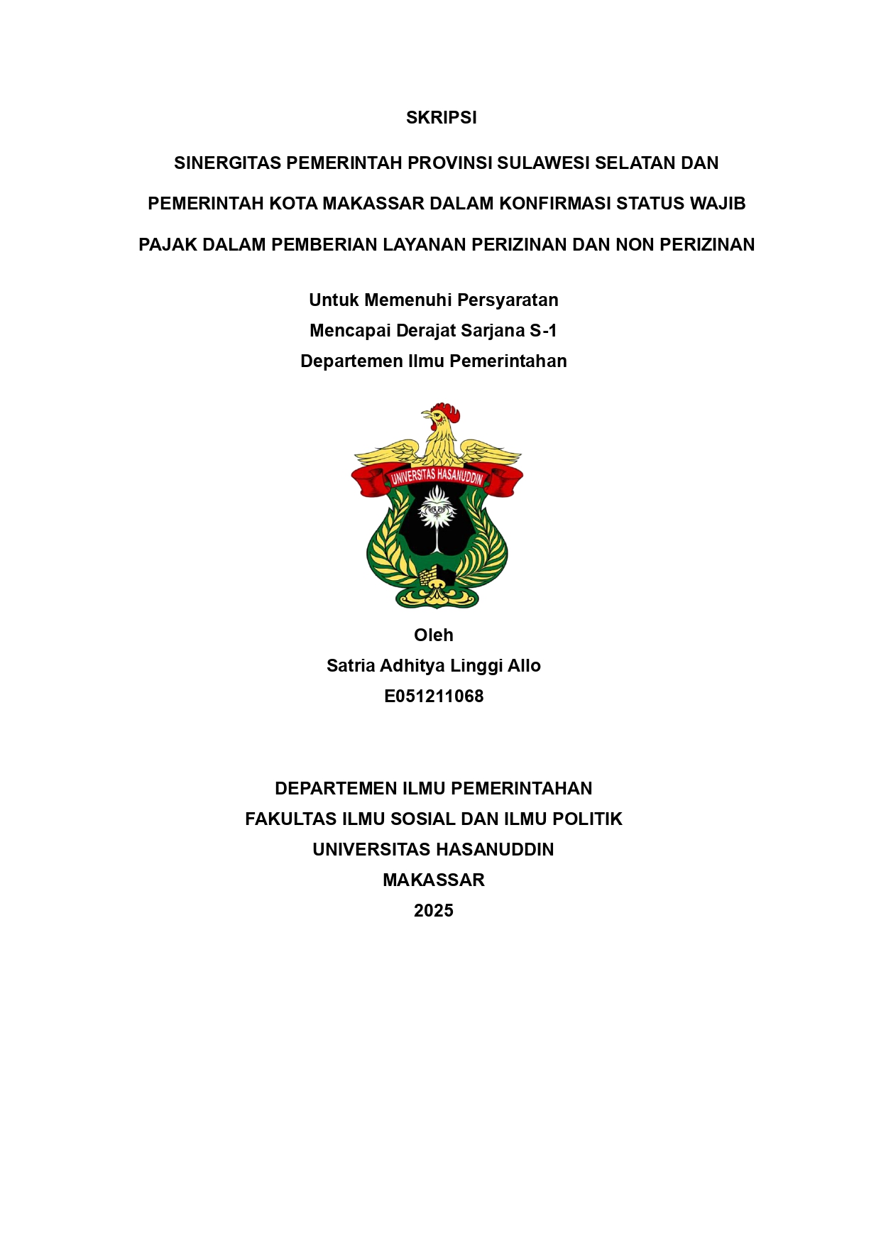 ALLO, SATRIA ADHITYA LINGGI (2025) SINERGITAS PEMERINTAH PROVINSI SULAWESI SELATAN DAN PEMERINTAH KOTA MAKASSAR DALAM KONFIRMASI STATUS WAJIB PAJAK DALAM PEMBERIAN LAYANAN PERIZINAN DAN NON PERIZINAN = SYNERGY BETWEEN THE SOUTH SULAWESI PROVINCIAL GOVERNMENT AND THE CITY GOVERNMENT OF MAKASSAR IN CONFIRMING TAXPAYER STATUS IN THE PROVISION OF LICENSING AND NON-LICENSING SERVICES. Skripsi thesis, UNIVERSITAS HASANUDDIN.
