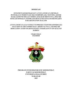 SUPLEMENTASI EKSTRAK DAUN ANNONA MURICATA MENEKAN PENINGKATAN PERSENTASE OKLUSI TUNIKA INTIMA ARTERI ILIAKA KOMUNIS MELALUI MODULASI KADAR SERUM TNF-a, PDGF-BB SETELAH TINDAKAN ANGIOPLASTY DENGAN BALON KATETER FOGARTY PADA KELINCI NEW ZEALAND ABSTRAK Latar Belakang: Angioplasti menggunakan balon kateter Fogarty saat ini digunakan sebagai prosedur embolektomi terutama pada kasus acute limb ischemia (ALI). Namun, komplikasi tindakan ini umumnya berkontribusi terhadap perkembangan hiperplasia intima. Annona muricata diketahui memiliki efek antiinflamasi dan antiproliferatif yang berpotensi mencegah proses tersebut. Tujuan: Mengetahui pengaruh Annona muricata terhadap penurunan persentase oklusi arteri iliaka komunis, kadar TNF-α dan PDGF-BB, serta ketebalan tunika intima pasca angioplasti dengan balon kateter Fogarty. Material dan Metode: Studi eksperimental menggunakan 17 ekor kelinci New Zealand White yang dibagi dalam empat kelompok: kontrol negatif (diberikan tindakan angioplasti dan tanpa intervensi) dan tiga kelompok perlakuan yang menjalani angioplasti serta mendapat Annona muricata dengan dosis 200, 400, dan 600 mg/kgBB secara oral selama 28 hari. Evaluasi dilakukan terhadap persentase oklusi (histopatologi), kadar serum TNF-α dan PDGF-BB (ELISA). Hasil: Kelompok dengan dosis 200 mg/kgBB menunjukkan penekanan peningkatan persentase oklusi arteri yang paling signifikan dibanding kelompok lain. Hal ini disertai dengan penurunan kadar TNF-α, PDGF-BB, dan ketebalan tunika intima secara bermakna (p<0,05). Kesimpulan: Annona muricata dosis 200 mg/kgBB efektif dalam menekan peningkatan persentase oklusi arteri pasca angioplasti melalui mekanisme antiinflamasi dan antiproliferatif. Temuan ini mendukung potensi Annona muricata sebagai terapi adjuvan dalam prosedur endovaskular.