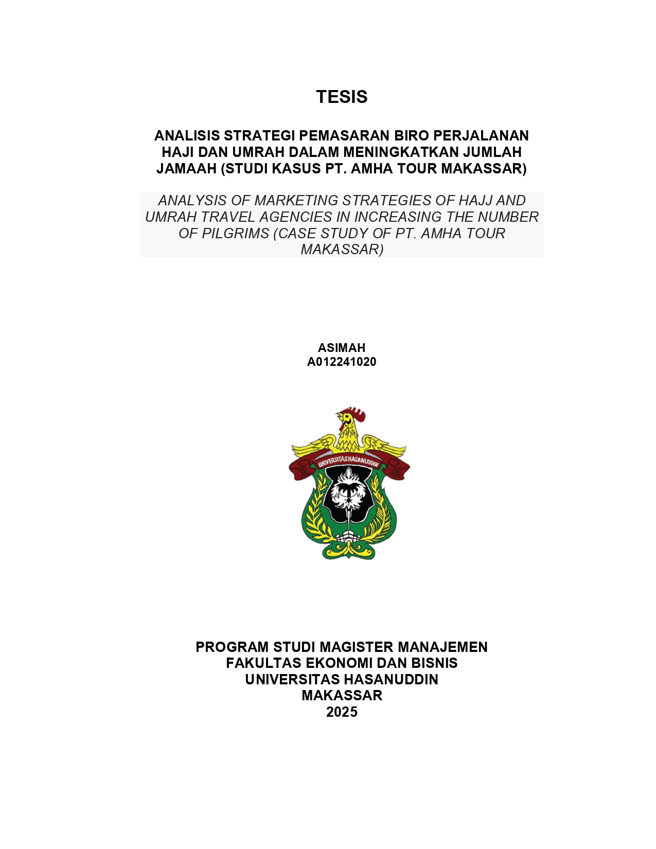 ASIMAH, ASIMAH (2025) ANALISIS STRATEGI PEMASARAN BIRO PERJALANAN HAJI DAN UMRAH DALAM MENINGKATKAN JUMLAH JAMAAH (STUDI KASUS PT. AMHA TOUR MAKASSAR) = ANALYSIS OF MARKETING STRATEGIES OF HAJJ AND UMRAH TRAVEL AGENCIES IN INCREASING THE NUMBER OF PILGRIMS (CASE STUDY OF PT. AMHA TOUR MAKASSAR). Thesis thesis, Universitas Hasanuddin.