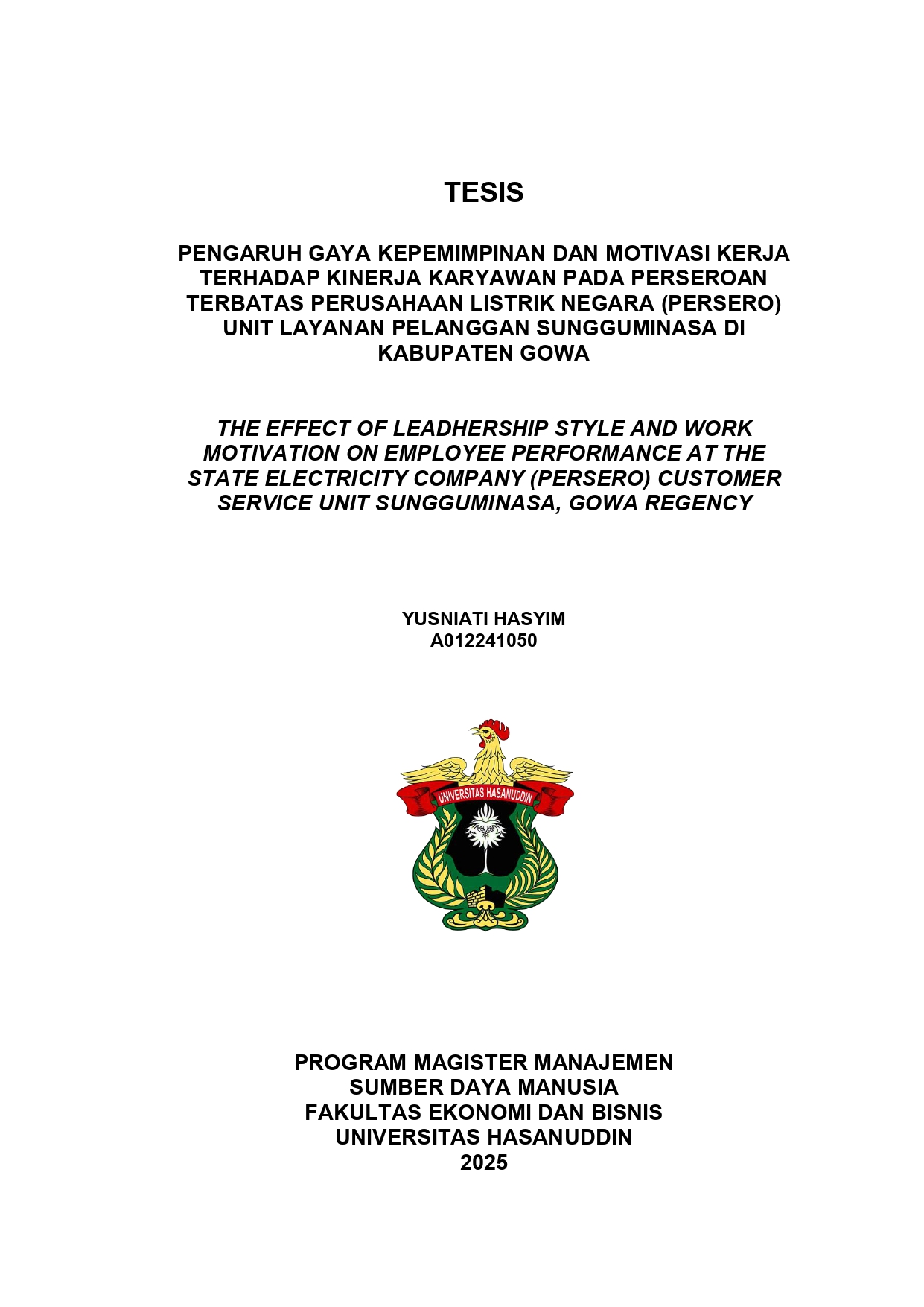 HASYIM, YUSNIATI (2025) PENGARUH GAYA KEPEMIMPINAN DAN MOTIVASI KERJA TERHADAP KINERJA KARYAWAN PADA PERSEROAN TERBATAS PERUSAHAAN LISTRIK NEGARA (PERSERO) UNIT LAYANAN PELANGGAN SUNGGUMINASA DI KABUPATEN GOWA = THE EFFECT OF LEADHERSHIP STYLE AND WORK MOTIVATION ON EMPLOYEE PERFORMANCE AT THE STATE ELECTRICITY COMPANY (PERSERO) CUSTOMER SERVICE UNIT SUNGGUMINASA, GOWA REGENCY. Thesis thesis, Universitas Hasanuddin.
