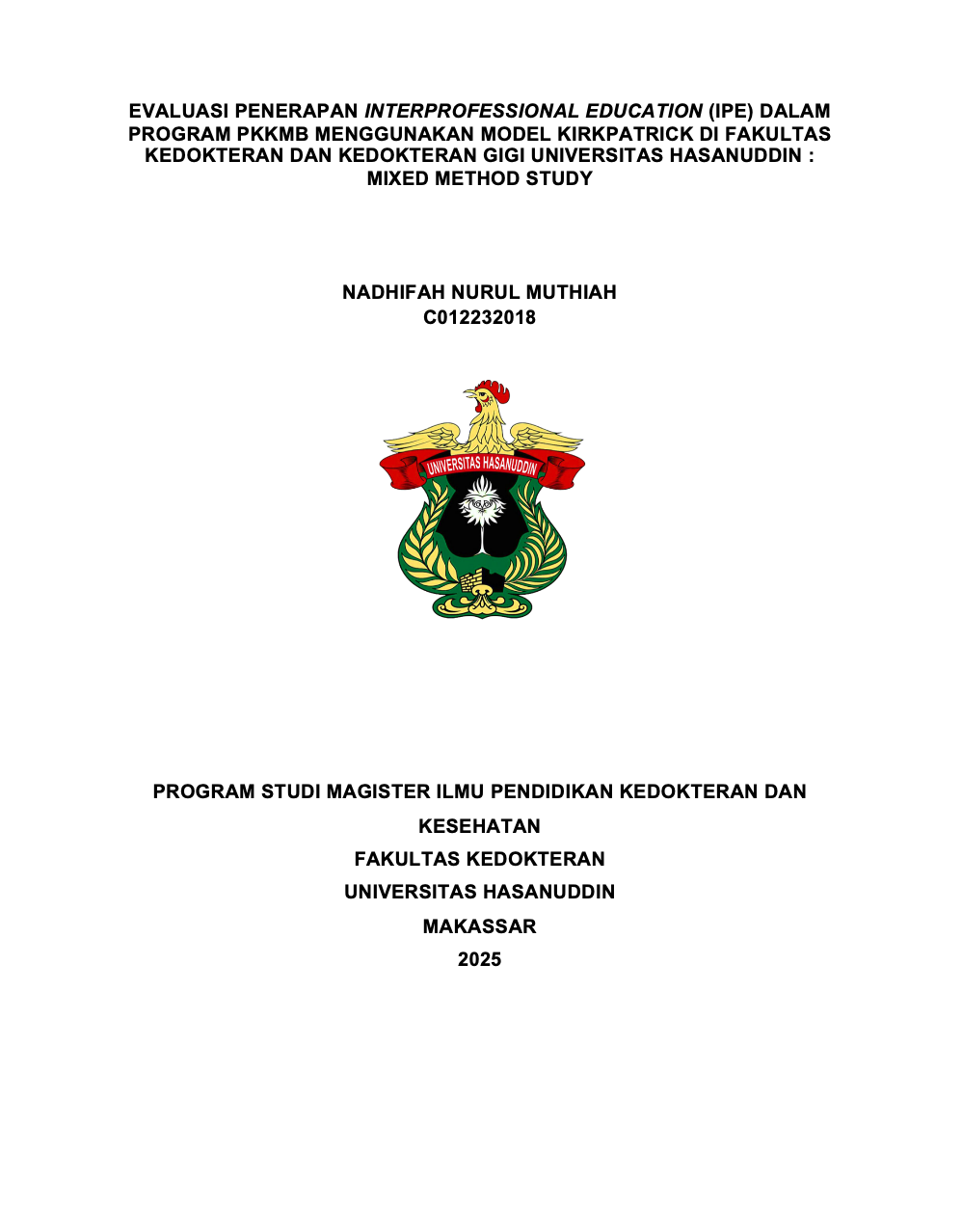 MUTHIAH, NADHIFAH NURUL (2025) EVALUASI PENERAPAN INTERPROFESSIONAL EDUCATION (IPE) DALAM PROGRAM PKKMB MENGGUNAKAN MODEL KIRKPATRICK DI FAKULTAS KEDOKTERAN DAN KEDOKTERAN GIGI UNIVERSITAS HASANUDDIN : MIXED METHOD STUDY = EVALUATION OF THE IMPLEMENTATION OF INTERPROFESSIONAL EDUCATION (IPE) IN THE PKKMB PROGRAM USING THE KIRKPATRICK MODEL AT THE FACULTY OF MEDICINE AND DENTISTRY, HASANUDDIN UNIVERSITY : MIXED METHOD STUDY. Thesis thesis, Universitas Hasanuddin.