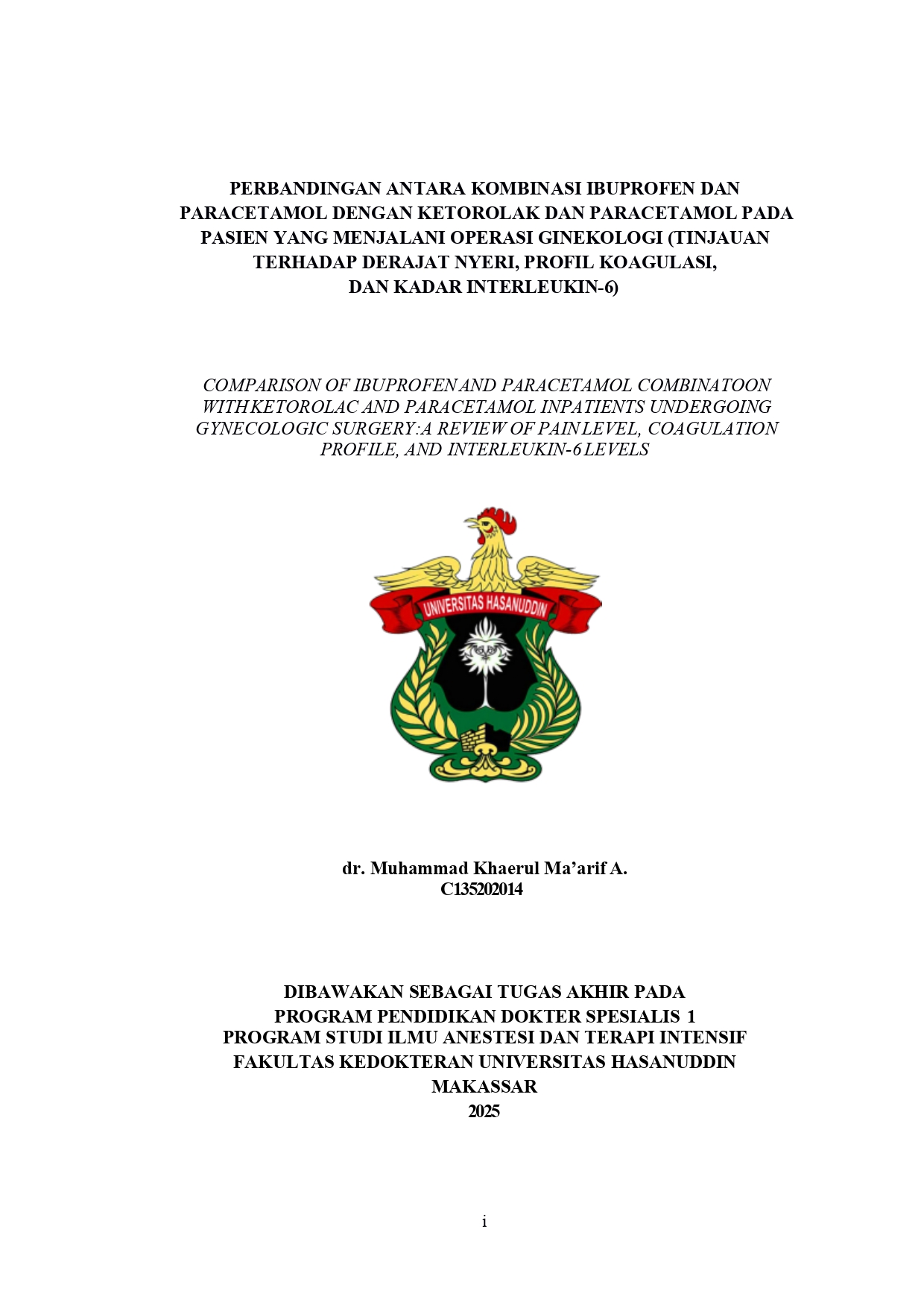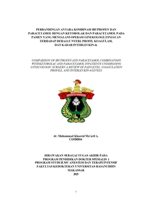 MA'ARIF A., MUHAMMAD KHAERUL (2025) PERBANDINGAN ANTARA KOMBINASI IBUPROFEN DAN PARACETAMOL DENGAN KETOROLAK DAN PARACETAMOL PADA PASIEN YANG MENJALANI OPERASI GINEKOLOGI (TINJAUAN TERHADAP DERAJAT NYERI, PROFIL KOAGULASI, DAN KADAR INTERLEUKIN-6) = COMPARISON OF IBUPROFEN AND PARACETAMOL COMBINATOON WITH KETOROLAC AND PARACETAMOL INPATIENTS UNDERGOING GYNECOLOGIC SURGERY:A REVIEW OF PAIN LEVEL, COAGULATION PROFILE, AND INTERLEUKIN-6 LEVELS. Skripsi thesis, Universitas Hasanuddin.