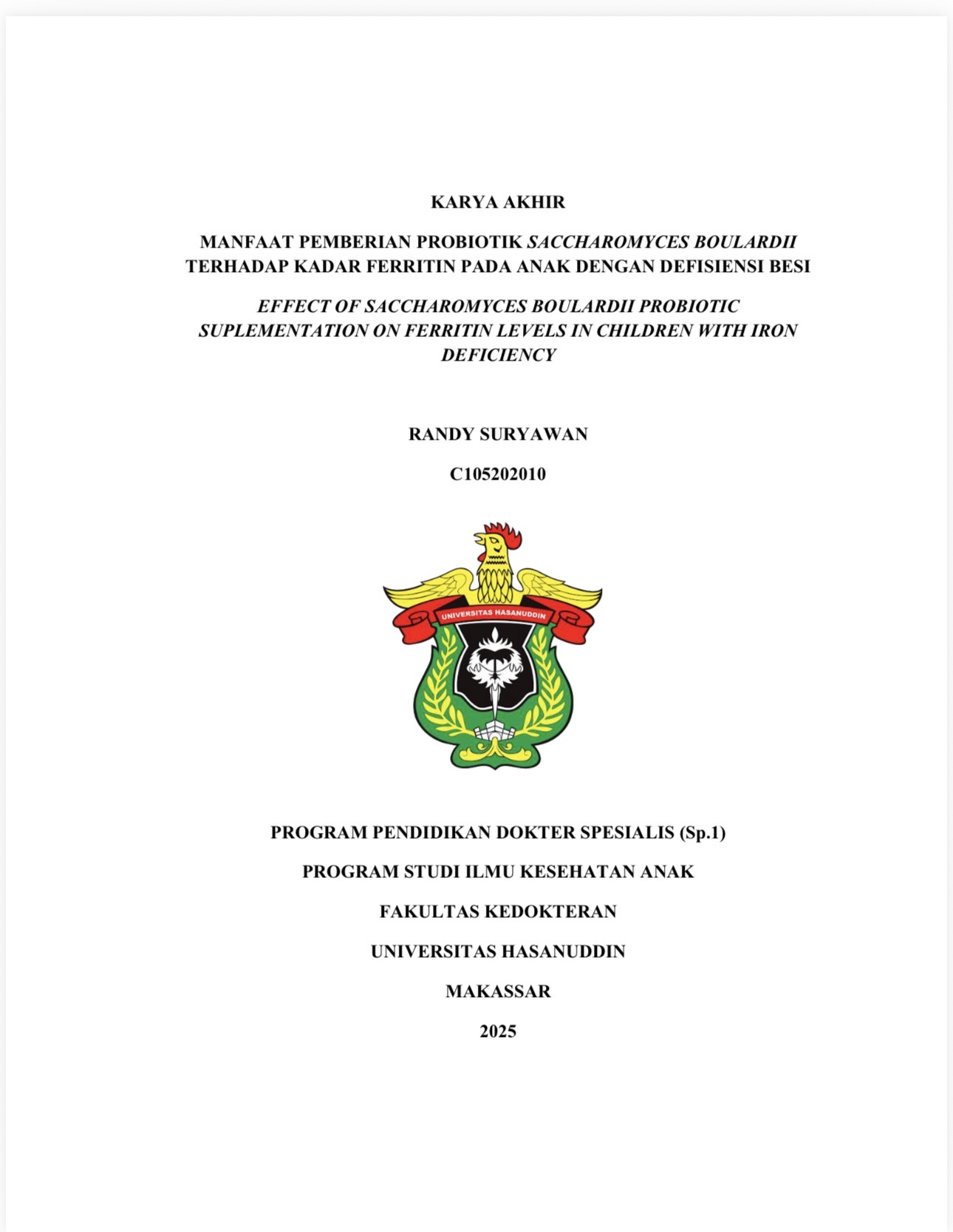 SURYAWAN, RANDY (2025) Manfaat pemberian probiotik saccharomyces boulardii terhadap kadar ferritin pada anak dengan defisiensi besi = Effect of saccharomyces boulardii probiotic supplementation on ferritin levels in children with iron deficiency. Skripsi thesis, Universitas Hasanuddin.