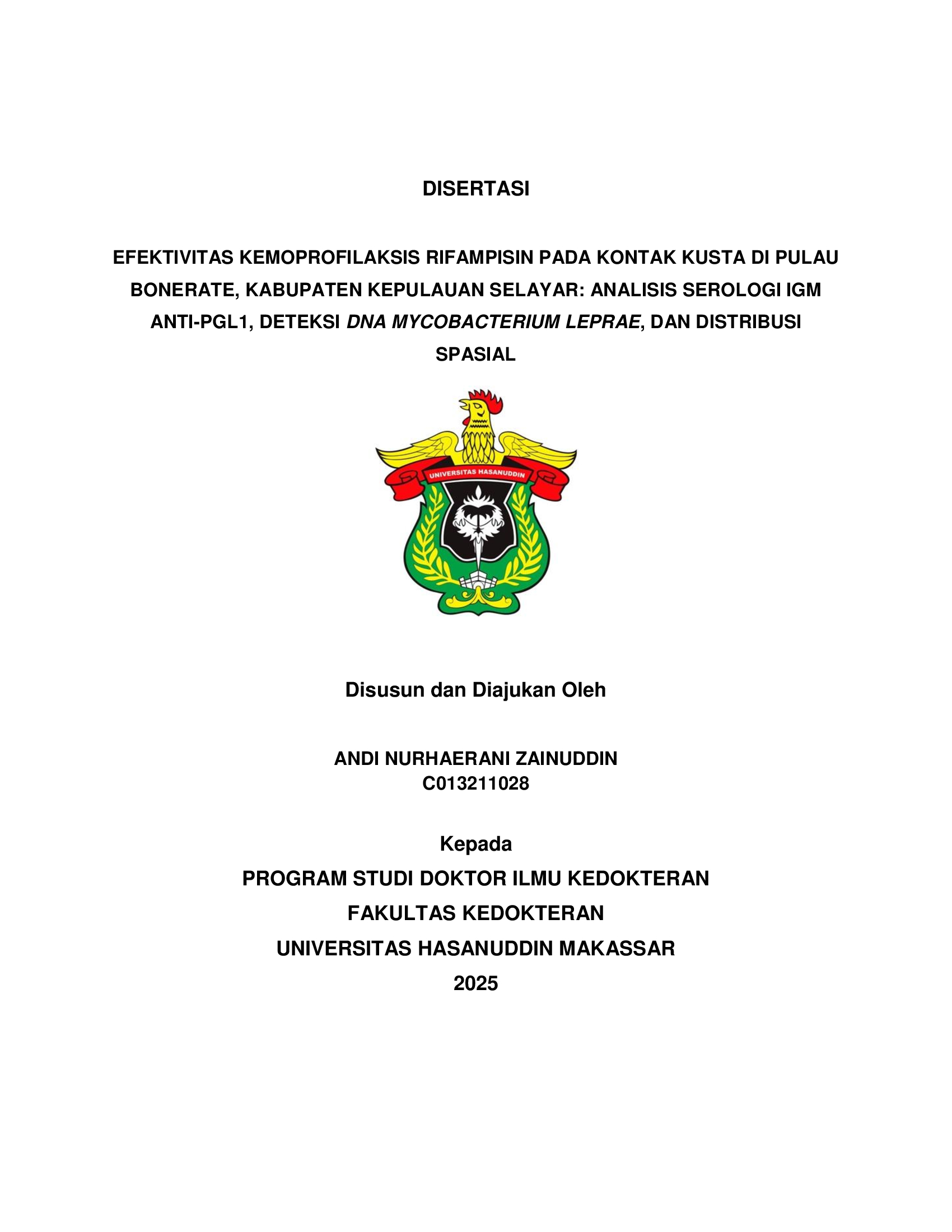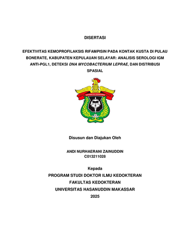 ZAINUDDIN, ANDI NURHAERANI (2026) EFEKTIVITAS KEMOPROFILAKSIS RIFAMPISIN PADA KONTAK KUSTA DI PULAU BONERATE, KABUPATEN KEPULAUAN SELAYAR: ANALISIS SEROLOGI IGM ANTI-PGL1, DETEKSI DNA MYCOBACTERIUM LEPRAE, DAN DISTRIBUSI SPASIAL = EFEKTIVITAS KEMOPROFILAKSIS RIFAMPISIN PADA KONTAK KUSTA DI PULAU BONERATE, KABUPATEN KEPULAUAN SELAYAR: ANALISIS SEROLOGI IGM ANTI-PGL1, DETEKSI DNA MYCOBACTERIUM LEPRAE, DAN DISTRIBUSI SPASIAL. Disertasi thesis, Universitas Hasanuddin.
