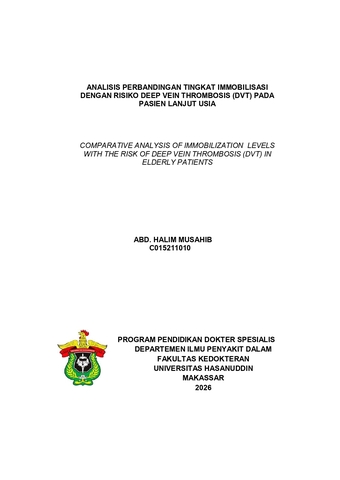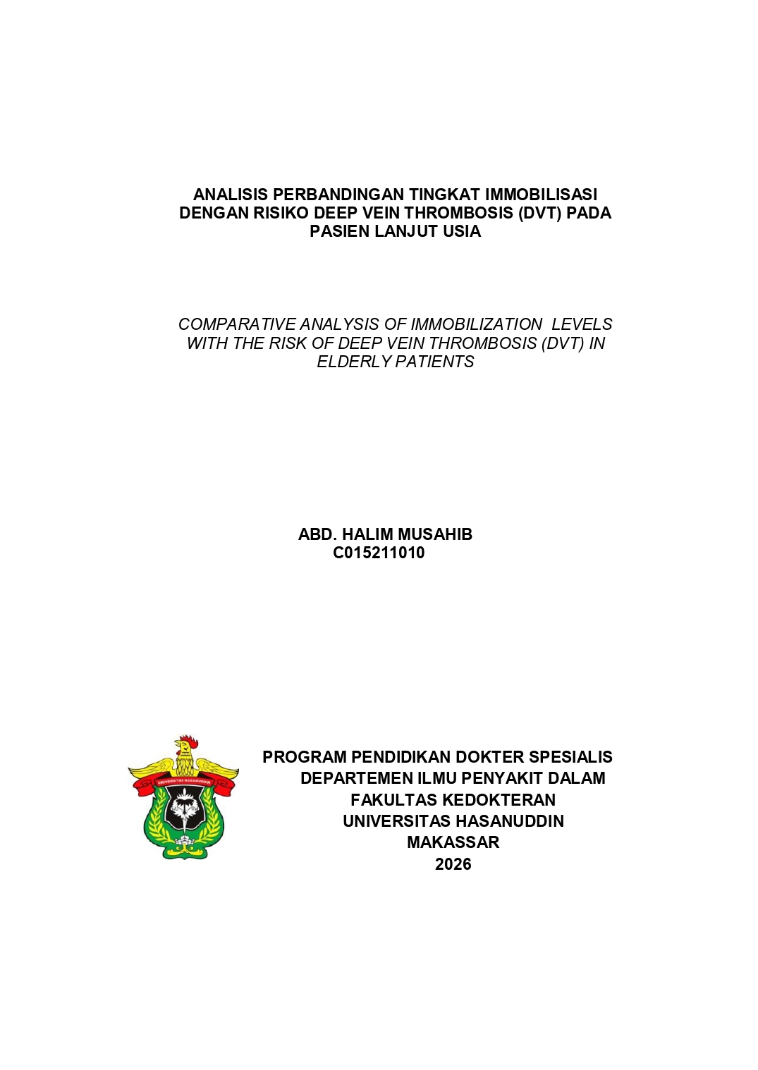 MUSAHIB, ABD. HALIM (2026) ANALISIS PERBANDINGAN TINGKAT IMMOBILISASI DENGAN RISIKO DEEP VEIN THROMBOSIS (DVT) PADA PASIEN LANJUT USIA = COMPARATIVE ANALYSIS OF IMMOBILIZATION LEVELS WITH THE RISK OF DEEP VEIN THROMBOSIS (DVT) IN ELDERLY PATIENTS. Disertasi thesis, Universitas Hasanuddin.