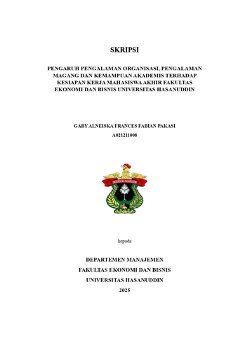 PAKASI, GABY ALNEISKA FRANCES FABIAN (2025) PENGARUH PENGALAMAN ORGANISASI, PENGALAMAN MAGANG, DAN KEMAMPUAN AKADEMIS TERHADAP KESIAPAN KERJA MAHASISWA AKHIR FAKULTAS EKONOMI DAN BISNIS UNIVERSITAS HASANUDDIN = THE EFFECT OF ORGANISATIONAL EXPERIENCE, INTERNSHIP EXPERIENCE, AND ACADEMIC ABILITY ON THE WORK READINESS OF FINAL YEAR STUDENTS IN THE FACULTY OF ECONOMICS AND BUSINESS AT HASANUDDIN UNIVERSITY. Skripsi thesis, Universitas Hasanuddin.