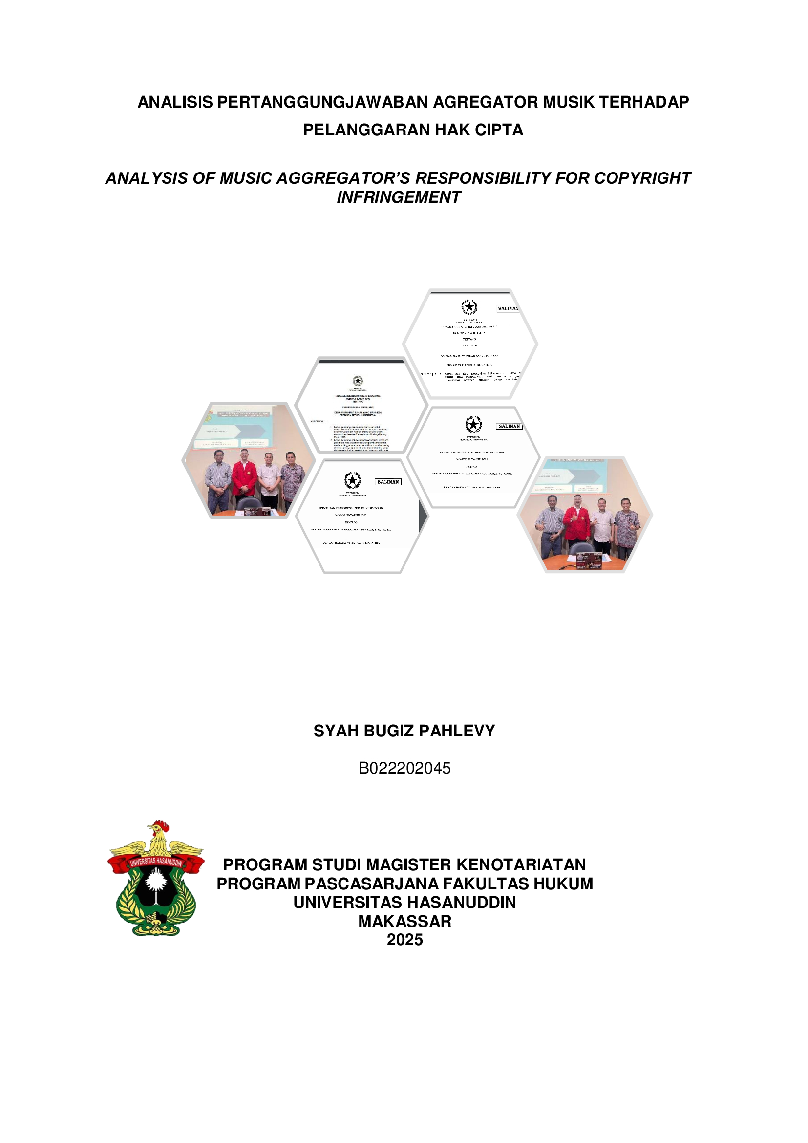 SYAH BUGIZ PAHLEVY (B022202057). Dengan Judul Analisis Pertanggungjawaban Agregator Musik terhadap Pelanggaran Hak Cipta (Dibimbing Oleh Hamzah Halim) Penelitian ini bertujuan untuk (1) menganalisa realita dalam penggunaan musik dan lagu di platform digital Spotify yang dalam penggunaannya sering dimanfaatkan oleh orang-orang yang tidak bertanggung jawab dengan melakukan pembajakan. Permasalahan dalam penelitian ini, pertama bagaimana perlindungan hukum terhadap pemegang hak cipta yang pengguna jasa agregator musik ditinjau dari Undang-undang Perlindungan Konsumen dan Undang-undang Hak Cipta. (2) Bagaimana pertanggungjawaban hukum agregator musik terhadap pelanggaran hak cipta. Penelitian ini merupakan jenis penelitian normatif-empiris. Penelitian ini adalah pendekatan live case study. Objek penelitian dalam penelitian ini adalah perlindungan hukum terhadap pencipta karya musik pada platform digital Spotify, beserta pertanggungjawaban hukum platform digital spotify sebagai agregator musik. Subjek penilitian ini adalah Artist and Repertoar (A&R) pada label Hits Record (PT.Suara Mas Abadi) selaku label yang menggunakan platform digital Spotify dan Direktur Hak Cipta dan Desain Industri pada Dirjen Kekayaan Intelektual (DJKI). Sumber data yang digunakan dalam penelitian ini adalah sumber data primer yang didukung dengan sumber data sekunder. Teknik pengumpulan data yang dilakukan dalam penelitian ini adalah wawancara, studi dokumen, dan studi kepustakaan. Penelitian ini menggunakan metode analisis kualitatif. Hasil penelitian ini menyebutkan bahwa perlindungan hukum terhadap pencipta musik dan lagu pada penghimpunan dan pendistribusian platform digital Spotify hanya sekedar menghapus konten bajakan musik dan lagu. Platform digital Spotify tidak memiliki ketentuan atau mekanisme khusus terkait hak ekonomi para pencipta musik. Pengaturan pada platform digital Spotify juga belum selaras dengan idealita Peraturan Perundang-undangan di Indonesia terkait penghimpunan dan pendistribusian royalti.