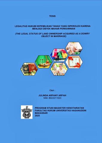 ABSTRAK JULINDA ARFANY ARFAH (B022211023) Dengan judul tesis Legalitas Kepemilikan Tanah Yang Diperoleh Karena Menjadi Obyek Mahar Perkawinan. Dibimbing oleh M Arfin Hamid. Latar Belakang, Dalam praktik perkawinan Islam mahar memiliki kedudukan penting sebagai bentuk penghargaan dari suami kepada istri. Salah satu bentuk mahar yang sering dijadikan objek adalah tanah. Namun, dalam banyak kasus, tanah sebagai mahar tidak segera dialihkan secara hukum perdata kepada pihak istri. Tujuan, Penelitian ini bertujuan untuk menganalisis kedudukan mahar dalam hukum Islam dan menelaah keabsahan bentuk mahar berupa tanah yang tidak dialihkan secara hukum perdata. Metode, Penelitian ini menggunakan pendekatan yuridis normatif dengan mengandalkan bahan hukum primer, sekunder, dan tersier melalui studi kepustakaan. Hasil, menunjukkan bahwa kedudukan mahar dalam hukum Islam adalah wajib, meskipun bukan syarat sahnya akad nikah. Mahar dapat berupa apa saja yang memiliki nilai, termasuk tanah. Namun, jika tidak dilakukan peralihan hak secara hukum positif (perdata), maka tanah tersebut belum sah berpindah tangan secara hukum negara. Hasil, Mahar berupa tanah tetap sah secara syariah meskipun belum dialihkan secara hukum, namun untuk menjamin perlindungan hukum terhadap hak istri, maka harus dilakukan peralihan hak melalui prosedur hukum perdata. Tanpa peralihan tersebut, istri tidak memiliki kekuatan hukum atas kepemilikan tanah tersebut. Hal ini menunjukkan pentingnya integrasi antara hukum Islam dan hukum nasional dalam pelaksanaan mahar.