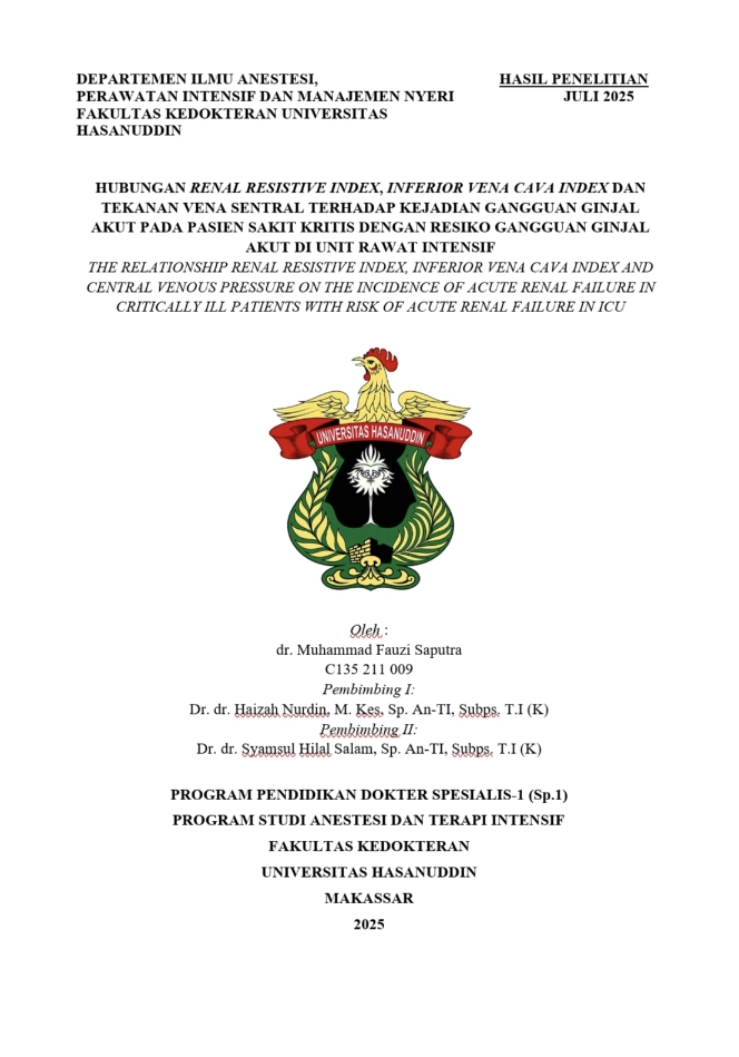 SAPUTRA, MUHAMMAD FAUZI (2025) HUBUNGAN RENAL RESISTIVE INDEX, INFERIOR VENA CAVA INDEX DAN TEKANAN VENA SENTRAL TERHADAP KEJADIAN GANGGUAN GINJAL AKUT PADA PASIEN SAKIT KRITIS DENGAN RESIKO GANGGUAN GINJAL AKUT DI UNIT RAWAT INTENSIF = THE RELATIONSHIP RENAL RESISTIVE INDEX, INFERIOR VENA CAVA INDEX AND CENTRAL VENOUS PRESSURE ON THE INCIDENCE OF ACUTE RENAL FAILURE IN CRITICALLY ILL PATIENTS WITH RISK OF ACUTE RENAL FAILURE IN ICU. Skripsi thesis, Universitas Hasanuddin.