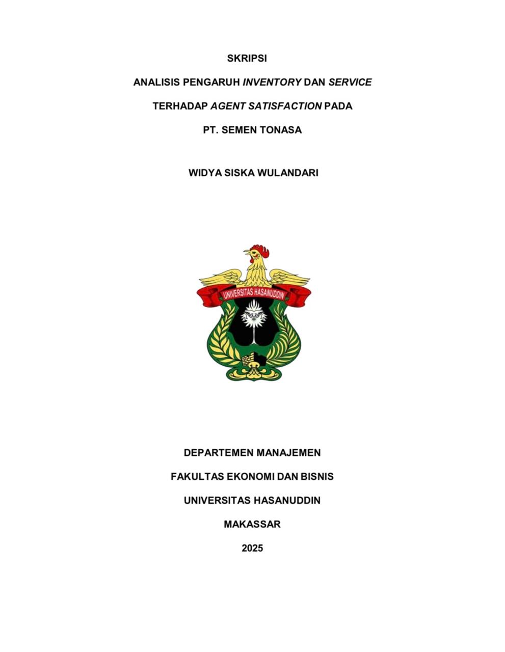 WULANDARI, WIDYA SISKA (2025) ANALISIS PENGARUH INVENTORY DAN SERVICE TERHADAP AGENT SATISFACTION PADA PT SEMEN TONASA = ANALYSIS OF THE INFLUENCE OF INVENTORY AND SERVICE ON AGENT SATISFACTION AT PT SEMEN TONASA. Skripsi thesis, Universitas Hasanuddin.