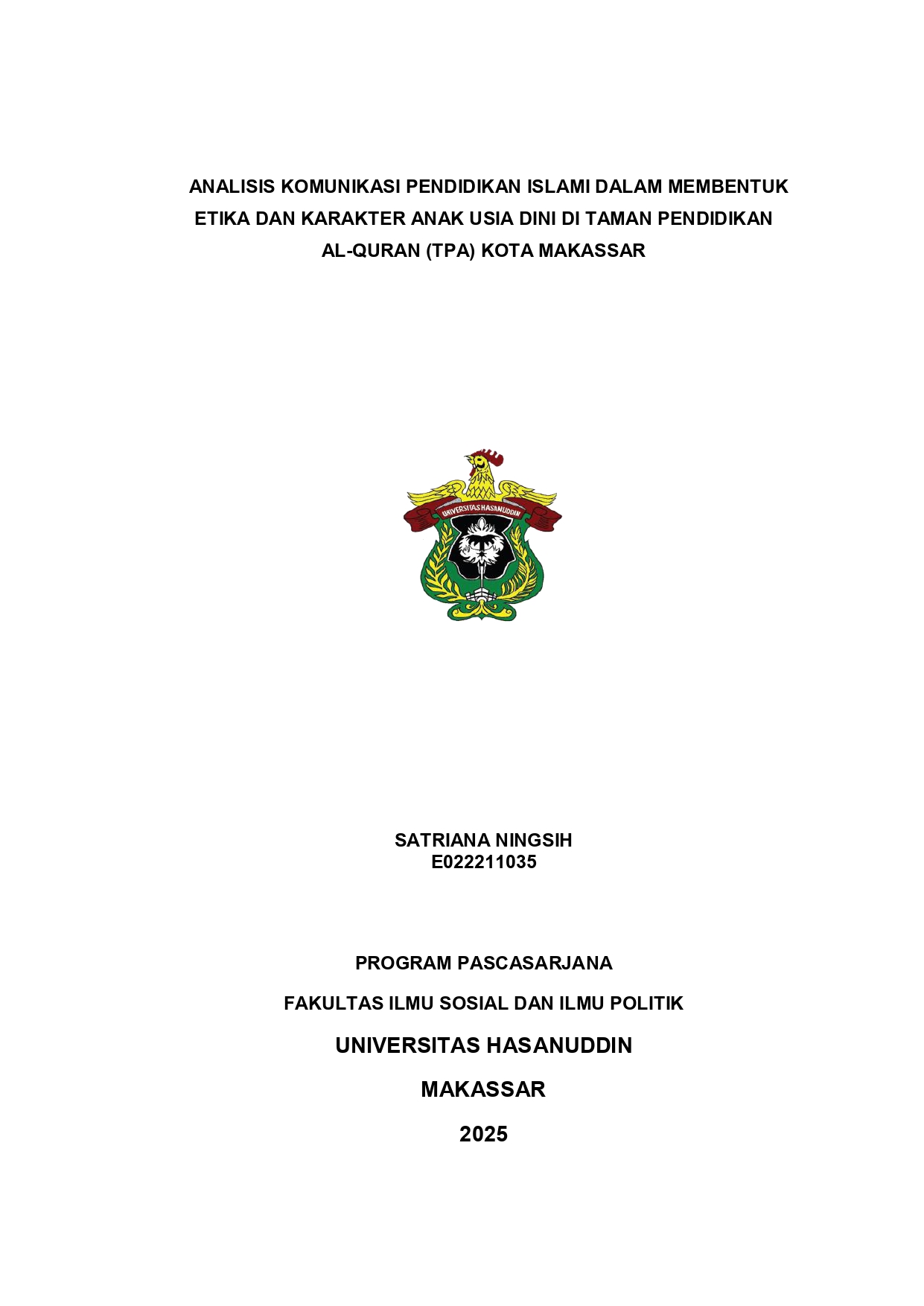 ABSTRAK SATRIANA NINGSIH. Analisis Komunikasi Pendidikan Islam dalam Membentuk Etika dan Karakter Anak Usia Dini di Taman Pendidikan Al-Quran Kota Makassar (dibimbing oleh Muliadi Mau dan Tuty Bahfiarti) Penelitian ini bertujuan untuk mendeskripsikan komunikasi pendidikan Islam yang efektif dalam menanamkan nilai-nilai etika dan karakter pada anak usia dini di Taman Pendidikan Al-Quran (TPA) Kota Makassar. Metode pengumpulan data yang digunakan adalah observasi, wawancara dan dokumentasi. Hasil penelitian menunjukkan bahwa komunikasi pendidikan Islam yang efektif dalam menanamkan nilai-nilai etika dan karakter Anak Usia Dini di Taman Pendidikan Al-Quran (TPA) di Kota Makassar berdasarkan Al-Quran yaitu Pembina berinteraksi kepada Santri dengan Melakukan salam sebelum berkomunikasi untuk menciptakan kedekatan, Menggunakan ucapan yang sopan dan lemah lembut, Ramah dan Terbuka dalam berkomunikasi, Menyesuaikan pembicaraan dan bahasa dengan memberikan contoh yang baik, Berdiskusi tentang sikap jujur yang harus dilakukan baik itu di Taman Pendidikan Al-Quran, di Rumah maupun di lingkungan sosial dan Memberikan penjelasan tentang pesan atau informasi akurat/benar yang mudah dimengerti dan kerjasama, percaya diri, mengeksplor pikiran dan imajinasi, tanggung jawab dan rasa solidaritas, berhasil mereka terapkan dalam kehidupan sehari-hari baik di Taman Pendidikan Al-Quran, rumah maupun di lingkungan sosial. Hambatan dalam menanamkan nilai-nilai Etika dan Karakter pada Anak Usia dini dapat berupa faktor lingkungan, keluarga, dan pengetahuan orang tua.