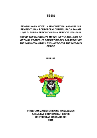 MUHLISA, MUHLISA (2025) PENGGUNAAN MODEL MARKOWITZ DALAM ANALISIS PEMBENTUKAN PORTOFOLIO OPTIMAL PADA SAHAM LQ45 DI BURSA EFEK INDONESIA PERIODE 2020- 2024 = USE OF THE MARKOWITZ MODEL INI THE ANALYSIS OF OPTIMAL PORTFOLIO FORMATION OF LQ45 STOCK ON THE INDONESIA STOCK EXCHANGE FOR THE 2020-2024 PERIOD MUHLISA. Thesis thesis, Universitas Hasanuddin.