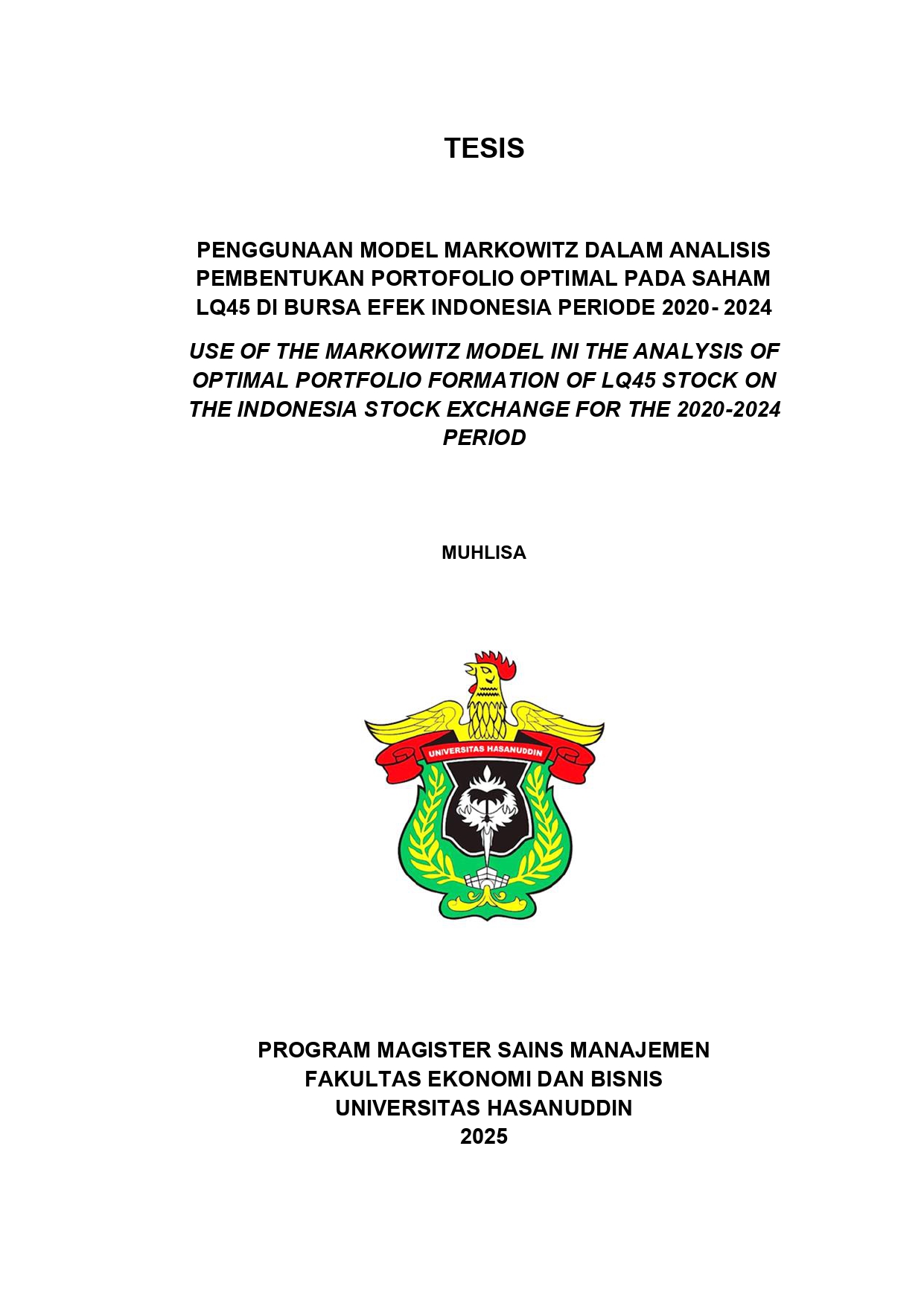 MUHLISA. Pembentukan Portofolio Optimal Dengan Menggunakan Model Markowitz Pada Saham Indeks LQ45 Periode 2020 – 2024” (dibimbing oleh Abdul Rakhman Laba dan Mursalim Nohong). Penelitian ini bertujuan untuk mengetahui pembentukan portofolio optimal dengan menggunakan model Markowitz pada saham indeks LQ45, sehingga diperoleh saham-saham yang dijadikan pilihan investasi atau membentuk portofolio pada periode 2020-2024. Penelitian ini menggunakan pendekatan kuantitatif deskriptif. Populasi dalam penelitian ini adalah seluruh saham emiten atau perusahaan yang pernah masuk dalam Indeks LQ45 di Bursa Efek Indonesia periode Februari 2020-Januari 2024 yaitu sebanyak 58 perusahaan sedangkan sampel dalam penelitian ini adalah 26 saham perusahaan yang dipilih berdasarkan metode purposive sampling. Pengumpulan data dilakukan dengan menggunakan teknik dokuementasi. Analisis data dilakukan dengan menggunakan model Markowitz Hasil penelitian ini menunjukkan bahwa dari 26 saham Indeks LQ45 yang dijadikan sampel penelitian menghasilkan 10 saham yang termasuk portofolio optimal yaitu saham ICBP,BBCA, KLBF,TBIG,TOWR,PTBA,TLKM ,ASII,ADRO, ITMG. Pada portofolio optimal yang terbentuk menghasilkan nilai expected return portofolio sebesar 0,0066 atau 0,66% dengan tingkat risiko portofolio sebesar 0,0332 atau 3,32%.