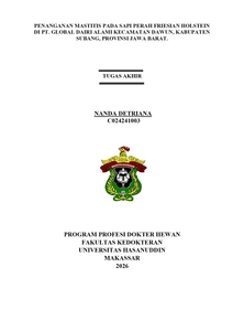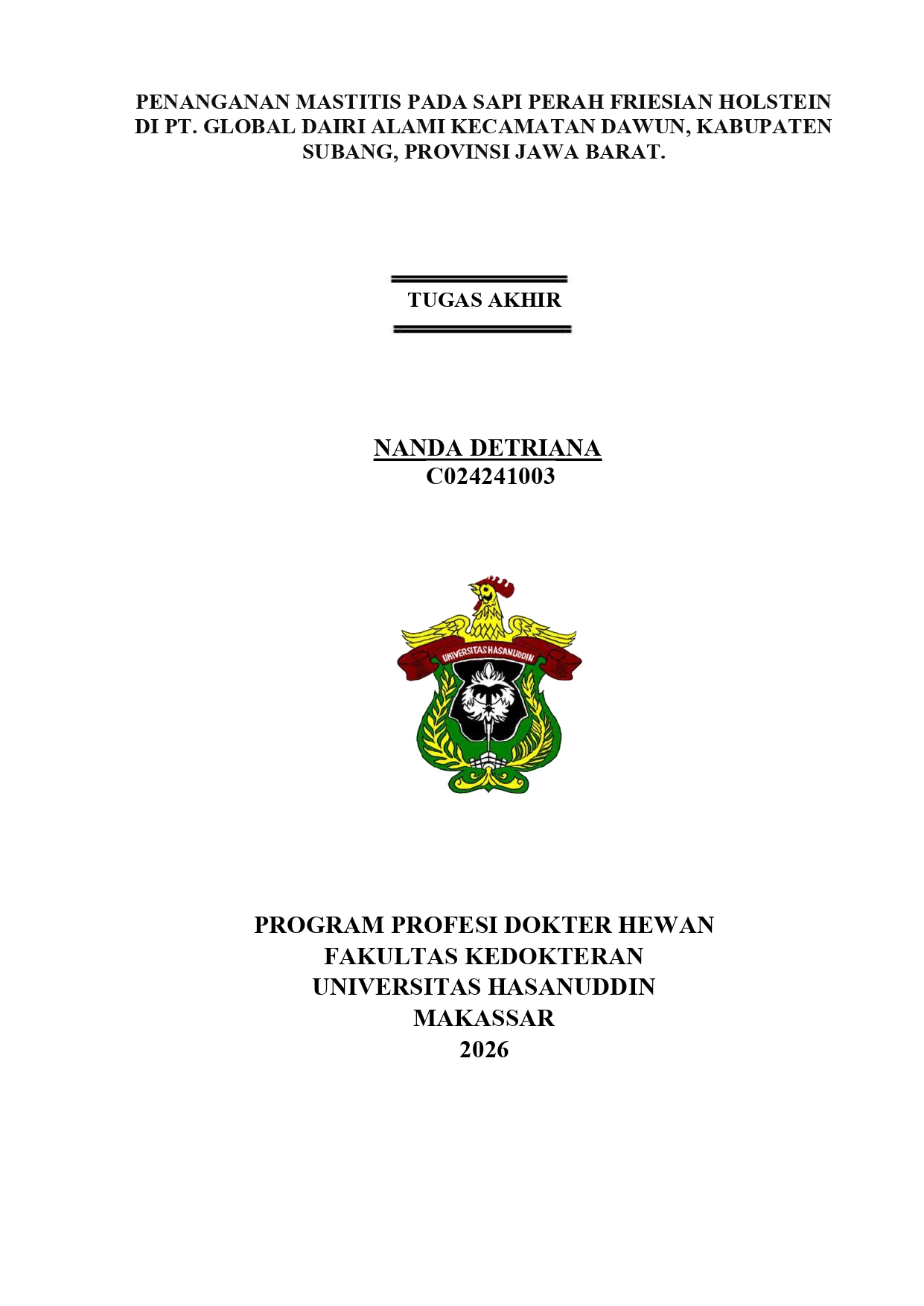 DETRIANA, NANDA (2026) PENANGANAN MASTITIS PADA SAPI PERAH FRIESIAN HOLSTEIN DI PT. GLOBAL DAIRI ALAMI KECAMATAN DAWUN, KABUPATEN SUBANG, PROVINSI JAWA BARAT. = Management of Mastitis in Friesian Holstein Dairy Cattle at PT. Global Dairi Alami, Dawun District, Subang Regency, West Java Province. Skripsi thesis, Universitas Hasanuddin.
