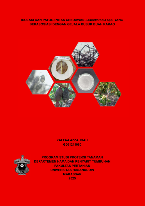 AZZAHRAH, ZALFAA (2025) Isolasi dan uji patogenitas cendawan Lasiodiplodia spp. yang berasosiasi dengan gejala busuk buah kakao = Isolat and Pathogenicity Test of Lasiodiplodia spp. Fungi Associated With Pod Rot Cacao Symptomps. Skripsi thesis, Universitas Hasanuddin.