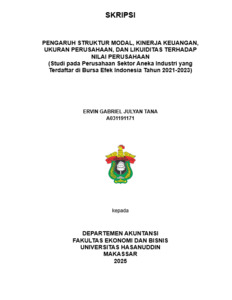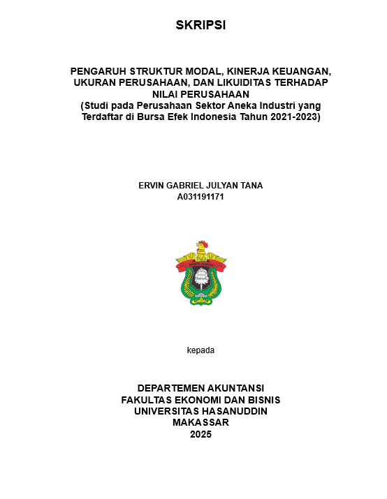 TANA, ERVIN GABRIEL JULYAN (2025) PENGARUH STRUKTUR MODAL, KINERJA KEUANGAN, UKURAN PERUSAHAAN, DAN LIKUIDITAS TERHADAP NILAI PERUSAHAAN (Studi pada Perusahaan Sektor Aneka Industri yang Terdaftar di Bursa Efek Indonesia Tahun 2021-2023) = The Effect of Capital Structure, Financial Performance, Firm Size, and Liquidity on Firm Value (Study on Industrials Sector Companies Listed In The Indonesian Stock Exchange 2021 – 2023). Skripsi thesis, Universitas Hasanuddin.