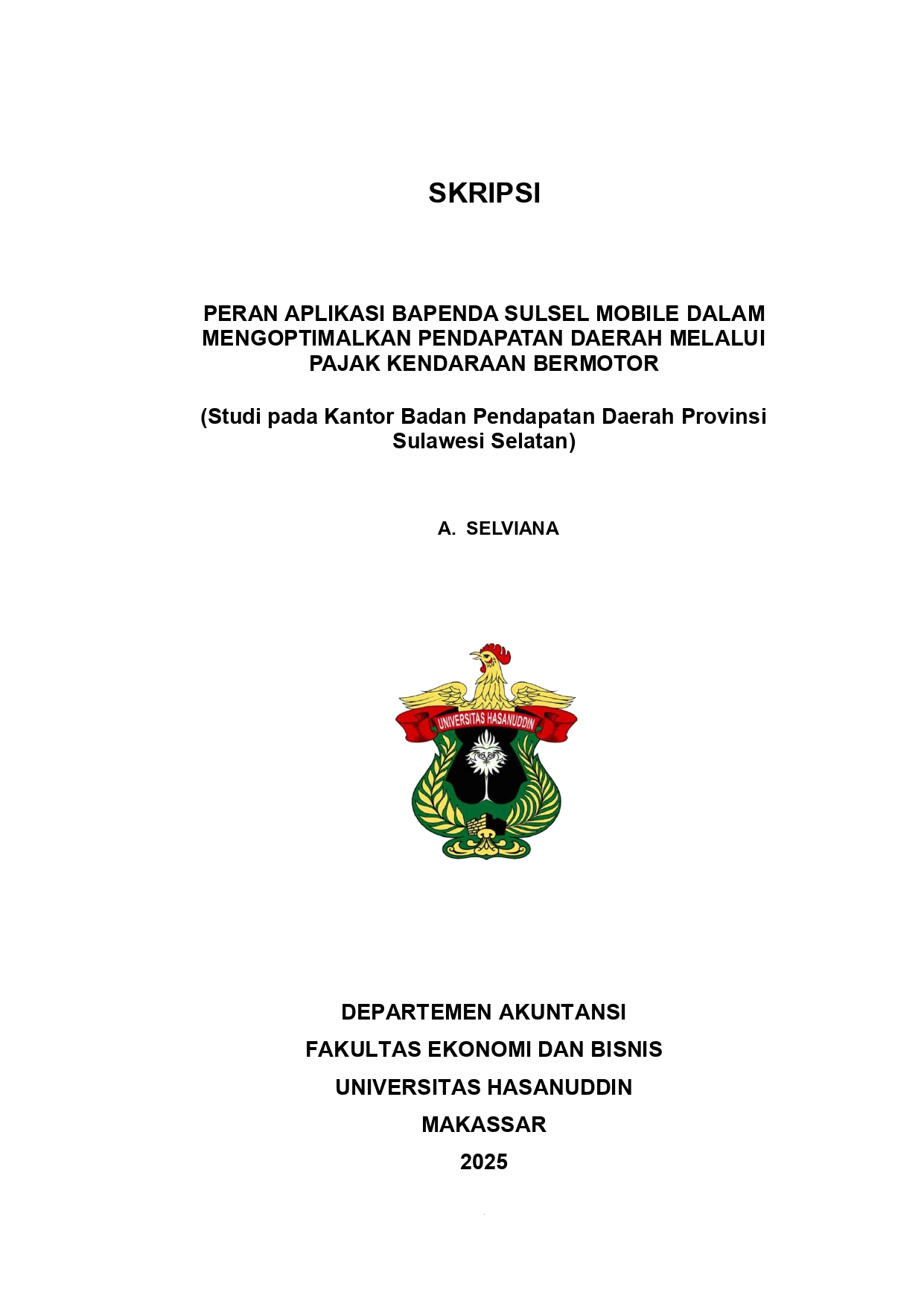 SELVIANA, A. (2025) PERAN APLIKASI BAPENDA SULSEL MOBILE DALAM MENGOPTIMALKAN PENDAPATAN DAERAH MELALUI PAJAK KENDARAAN BERMOTOR (Studi pada Kantor Badan Pendapatan Daerah Provinsi Sulawesi Selatan) = THE ROLE OF THE BAPENDA SULSEL MOBILE APPLICATION IN OPTIMIZING REGIONAL REVENUE THROUGH MOTOR VEHICLE TAX (Study at the Regional Revenue Agency Office of South Sulawesi Province). Skripsi thesis, Universitas Hasanuddin.