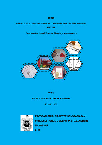 ANWAR, ANISAH NOVIANA CAESAR (2026) PERJANJIAN DENGAN SYARAT TANGGUH DALAM PERJANJIAN KAWIN = Suspensive Conditions in Marriage Agreements. Thesis thesis, UNIVERSITAS HASANUDDIN MAKASSAR.