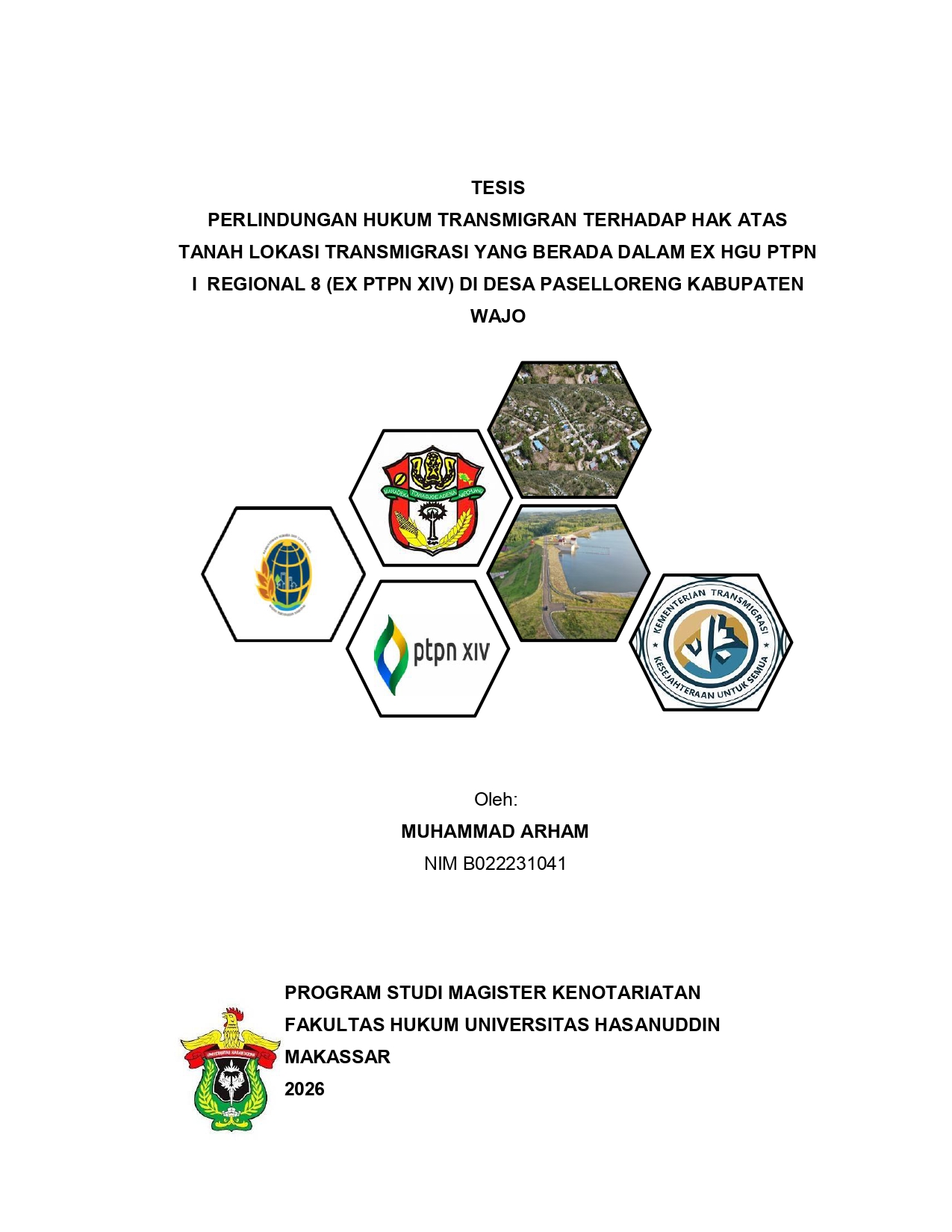ABSTRAK MUHAMMAD ARHAM (B022231041), Perlindungan Hukum Transmigran Terhadap Hak Atas Tanah Lokasi Transmigrasi Yang Berada Dalam Ex HGU PTPN I Regional 8 (Ex PTPN XIV) Di Paselloreng Wajo. Dibimbing oleh Kahar Lahae. Latar Belakang: Program transmigrasi membutuhkan kepastian hukum atas tanah sebagai dasar penempatan transmigran. Namun, di Desa Paselloreng Kabupaten Wajo, transmigran menempati tanah eks-HGU PTPN XIV (PTPN I Regional 8) yang secara agraria kembali menjadi aset negara, tetapi secara administrasi masih tercatat sebagai Barang Milik Negara (BMN). Dualisme status ini menimbulkan ketidakpastian hukum bagi transmigran karena hak atas tanah tidak dapat segera diberikan. Tujuan: Penelitian ini bertujuan untuk menganalisis status hukum tanah transmigrasi yang berada di wilayah paselloreng ex hgu ptpn xiv (ptpn regional 8) berdasarkan Peraturan Perundang-Undangan dan perlindungan hukum yang dihadapi dalam proses redistribusi lahan Ex HGU PTPN XIV (PTPN Regional 8) Kepada Transmigran Di Paselloreng. Metode: Penelitian ini adalah penelitian hukum normatif dengan menggunakan pendekatan perundang-undangan, konsep, dan kasus. Penelitian ini menggunakan bahan hukum primer dan bahan hukum sekunder.teknik pengumpulan bahan hukum menggunakan studi pustaka, didukung dengan wawancara. Bahan hukum dianalisis secara kualitatif untuk memberikan preskripsi terhadap permasalahan penelitian. Hasil: penelitian menunjukkan bahwa kedudukan tanah transmigrasi di atas tanah Ex-HGU berada dalam posisi ganda: secara agraria merupakan tanah negara, tetapi secara administratif masih menjadi aset BMN. Hal ini mengakibatkan lemahnya kepastian hukum bagi transmigran. Bentuk perlindungan hukum yang ideal adalah melalui sinkronisasi hukum agraria dan hukum keuangan negara dengan cara percepatan pelepasan status BMN oleh Kementerian Keuangan, sehingga hak milik atas tanah dapat diberikan kepada transmigran. Kesimpulan: penelitian ini menegaskan bahwa kepastian hukum bagi transmigran hanya dapat terwujud apabila ada koordinasi efektif antar kementerian dan penghapusan status BMN dilakukan secara cepat dan transparan.