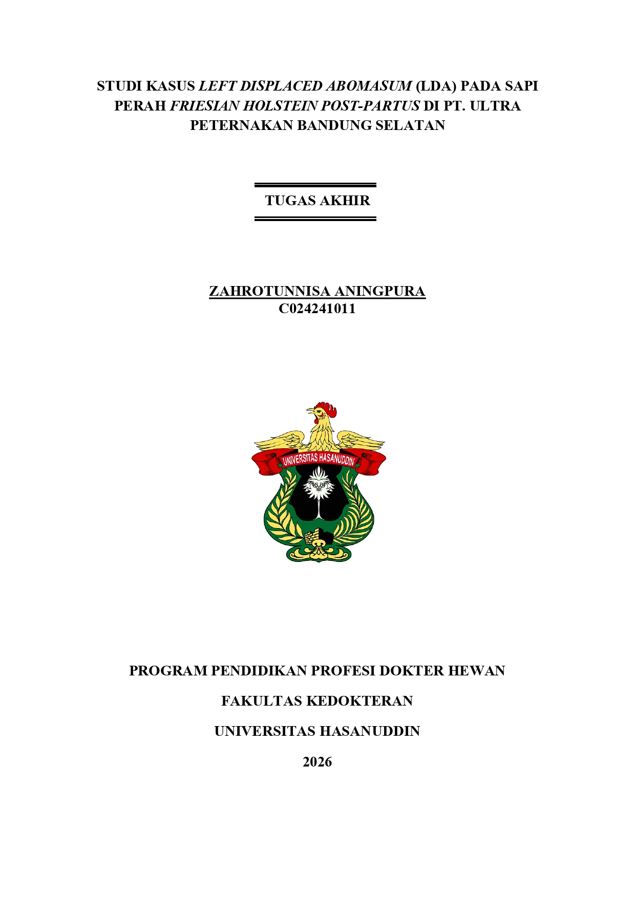 ANINGPURA, ZAHROTUNNISA (2026) Studi Kasus Left Displaced Abomasum (LDA) pada Sapi Perah Friesian Holstein Post-Patus di PT. Ultra Peternakan Bandung Selatan = Case Study of Left Displaced Abomasum (LDA) in Post-partum Friesian Holstein Dairy Cows at PT. Ultra Peternakan Bandung Selatan. Skripsi thesis, Universitas Hasanuddin.