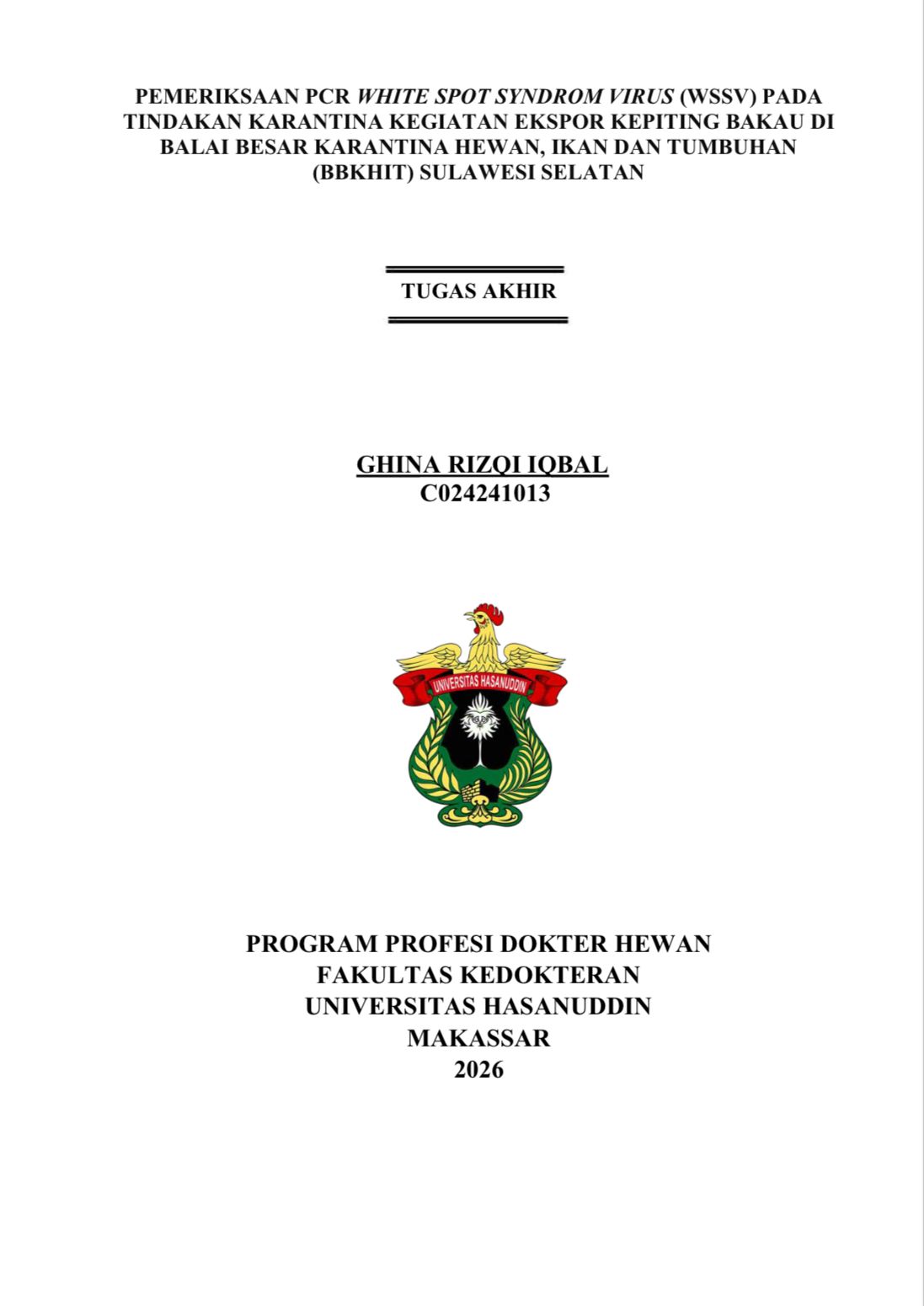 I IQBAL, GHINA RIZQI I (2026) Pemeriksaan PCR White Spot Syndrom Virus (WSSV) Pada Tindakan Karantina Kegiatan Ekspor Kepiting Bakau di Balai Besar Karantina Hewan, Ikan Dan Tumbuhan (BBKHIT) Sulawesi Selatan = PCR-Based Detection of White Spot Syndrome Virus (WSSV) in Mud Crab Export Quarantine Protocols at the South Sulawesi Center for Animal, Fish, and Plant Quarantine. Skripsi thesis, Universitas Hasanuddin.