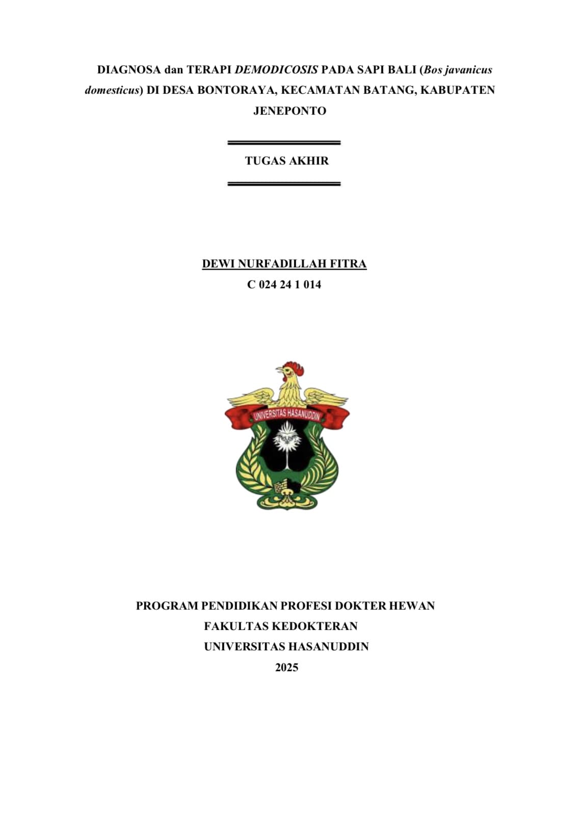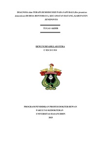 FITRA, DEWI NURFADILAH (2026) Diagnosa dan Terapi Demodicosis Pada Sapi Bali (Bos javanicus domesticus) Di Desa Bontoraya, Kec. Batang, Kab. Jeneponto = Diagnosis and Therapy of Demodicosis in Bali Cattle (Bos javanicus domesticus) In Bontoraya Village, Batang District, Jeneponto Regency. Skripsi thesis, Universitas Hasanuddin.