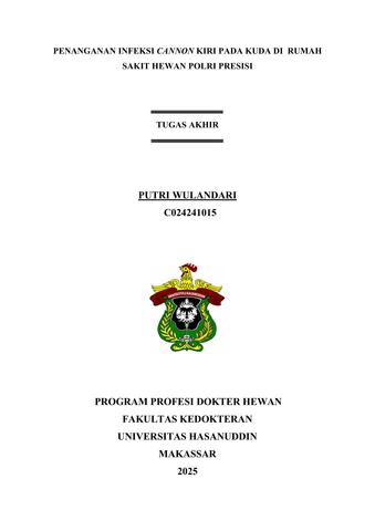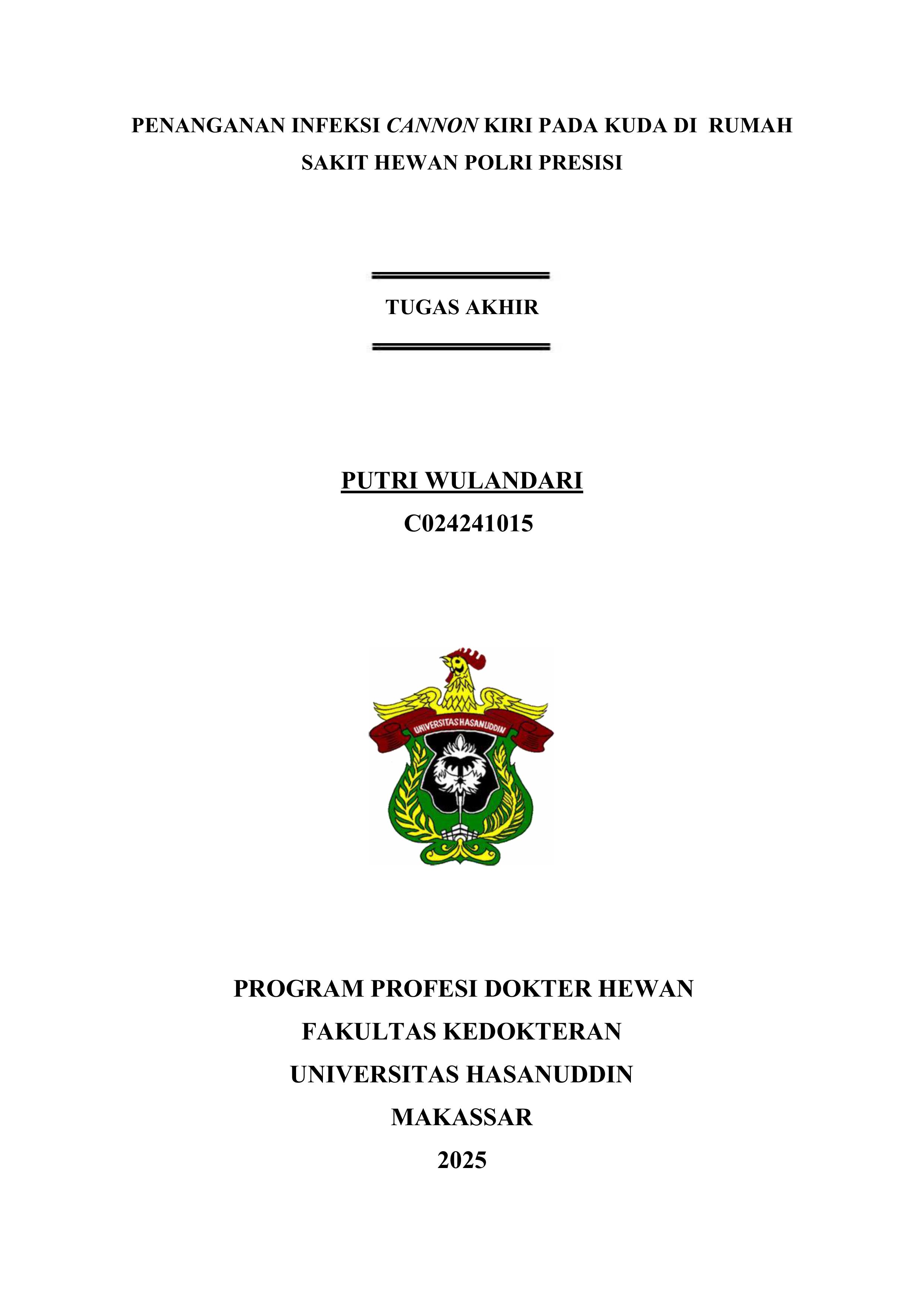 I WULANDARI, PUTRI (2026) PENANGANAN INFEKSI CANNON KIRI PADA KUDA DI RUMAH SAKIT HEWAN POLRI PRESISI = Treatment of Left Cannon Bone Infection in a Horse at the POLRI Presisi Veterinary Hospital. Skripsi thesis, Universitas Hasanuddin.