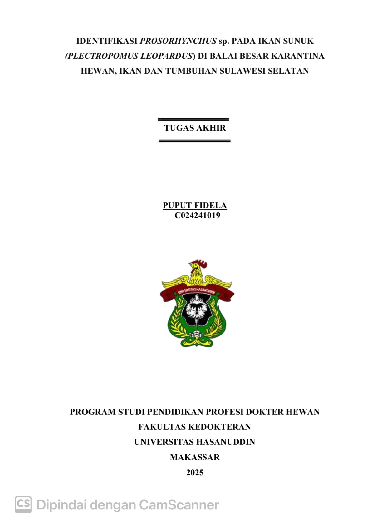 FIDELA, PUPUT (2026) IDENTIFIKASI PROSORHYNCHUS sp. PADA IKAN SUNUK (PLECTROPOMUS LEOPARDUS) DI BALAI BESAR KARANTINA HEWAN, IKAN DAN TUMBUHAN SULAWESI SELATAN = Identification of Prosorhynchus sp. in Coral Grouper (Plectropomus leopardus) at the Center for Animal, Fish, and Plant Quarantine of South Sulawesi. Skripsi thesis, Universitas Hasanuddin.