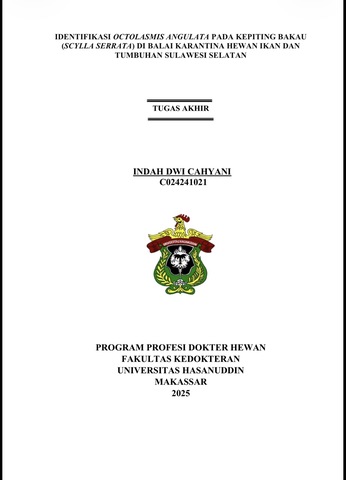 IDENTIFIKASI OCTOLASMIS ANGULATA PADA KEPITING BAKAU (SCYLLA SERRATA) DI BALAI KARANTINA HEWAN IKAN DAN TUMBUHAN SULAWESI SELATAN = IDENTIFICATION OF OCTOLASMIS ANGULATA IN MANDAC CRAB (SCYLLA SERRATA) AT THE SOUTH SULAWESI FISH AND PLANTS ANIMAL QUARANTINE CENTER