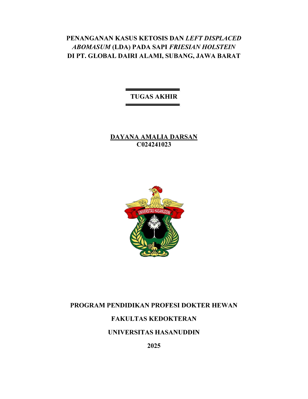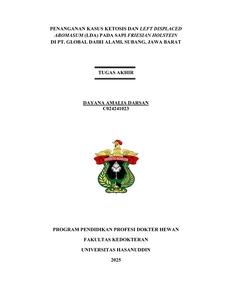 DARSAN, DAYANA AMALIA (2026) Penanganan Kasus Ketosis dan Left Displaced Abomasum (LDA) Pada Sapi Friesian Holstein di PT. Global Dairi Alami, Subang, Jawa Barat = Management of Ketosis and Left Displaced Abomasum (LDA) in Friesian Holstein Cows at PT. Global Dairi Alami, Subang, West Java. Skripsi thesis, Universitas Hasanuddin.