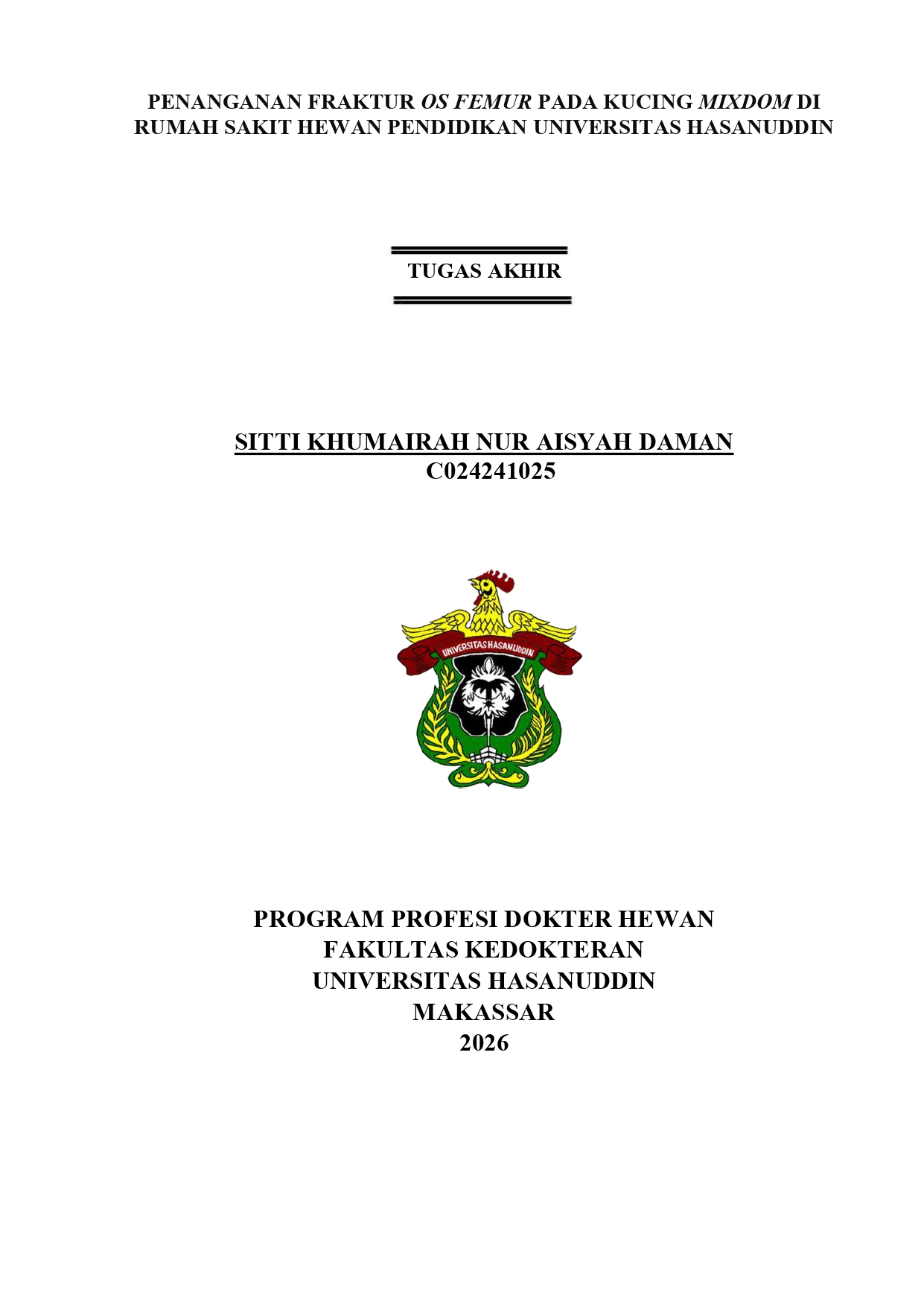 DAMAN, SITTI KHUMAIRAH NUR AISYAH (2028) PENANGANAN FRAKTUR OS FEMUR PADA KUCING MIXDOM DI RUMAH SAKIT HEWAN PENDIDIKAN UNIVERSITAS HASANUDDIN = Management of Femoral Fracture in a Mixed-Breed Cat at the Teaching Veterinary Hospital of Hasanuddin University. Skripsi thesis, Universitas Hasanuddin.
