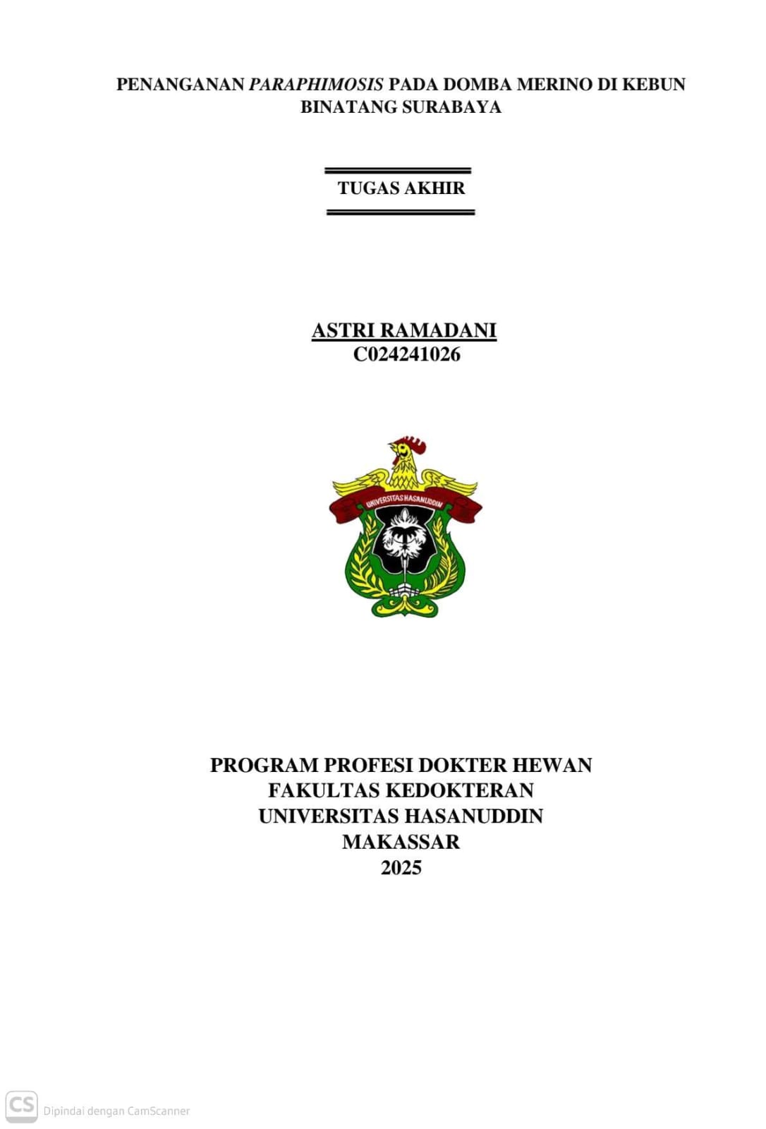 RAMADANI, ASTRI (2026) PENANGANAN PARAPHIMOSIS PADA DOMBA MERINO DI KEBUN BINATANG SURABAYA = MANAGEMENT OF PARAPHIMOSIS IN A MERINO SHEEP AT THE SURABAYA ZOO. Skripsi thesis, Universitas Hasanuddin.