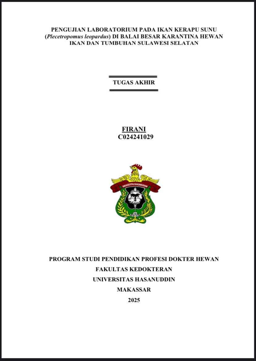 FIRANI, FIRANI (2026) PENGUJIAN LABORATORIUM PADA IKAN KERAPU SUNU (Plecetropomus leopardus) DI BALAI BESAR KARANTINA HEWAN IKAN DAN TUMBUHAN SULAWESI SELATAN = Laboratory Testing on Sunu Grouper (Plectropomus leopardus) at the Fish Quarantine Laboratory (BBKHIT) in South Sulawesi. Skripsi thesis, Universitas Hasanuddin.