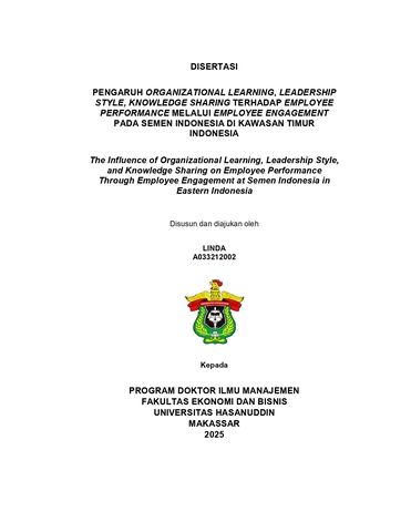 LINDA, LINDA (2025) PENGARUH ORGANIZATIONAL LEARNING, LEADERSHIP STYLE, KNOWLEDGE SHARING, TERHADAP EMPLOYEE PERFORMANCE MELALUI EMPLOYEE ENGAGEMENT PADA SEMEN INDONESIA DI KAWASAN TIMUR INDONESIA = THE INFLUENCE OF ORGANIZATIONAL LEARNING, LEADERSHIP STYLE AND KNOWLEDGE SHARING ON EMPLOYEE PERFORMANCE THROUGH EMPLOYEE ENGAGEMENT AT SEMEN INDONESIA IN THE EASTERN INDONESIA REAGON. Disertasi thesis, Universitas Hasanuddin.