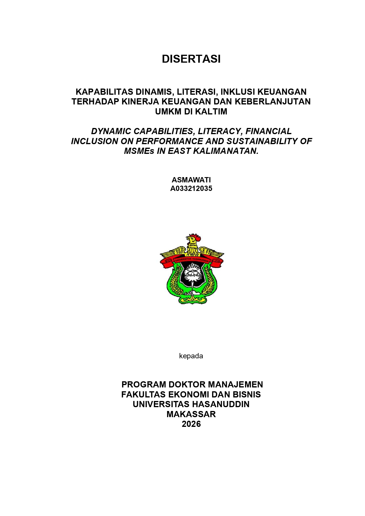 ASMAWATI, ASMAWATI (2026) KAPABILITAS DINAMIS, LITERASI, INKLUSI KEUANGAN TERHADAP KINERJA KEUANGAN DAN KEBERLANJUTAN UMKM DI KALTIM = DYNAMIC CAPABILITIES, LITERACY, FINANCIAL INCLUSION ON PERFORMANCE AND SUSTAINABILITY OF MSMEs IN EAST KALIMANATAN. Disertasi thesis, Universitas Hasanuddin.
