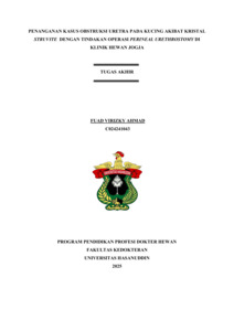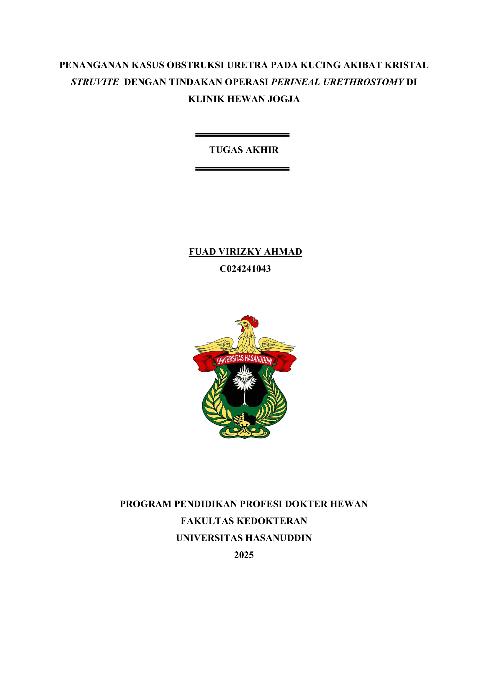 AHMAD, FUAD VIRIZKY (2025) Penanganan Kasus Obstruksi Uretra Pada Kucing Akibat Kristal Struvite Dengan Tindakan Operasi Perineal Urethrostomy di Klinik Hewan Jogja = Management of Urethral Obstruction in a Male Cat Caused by Struvite Crystals Treated with Perineal Urethrostomy: A Case Report. Skripsi thesis, Universitas Hasanuddin.