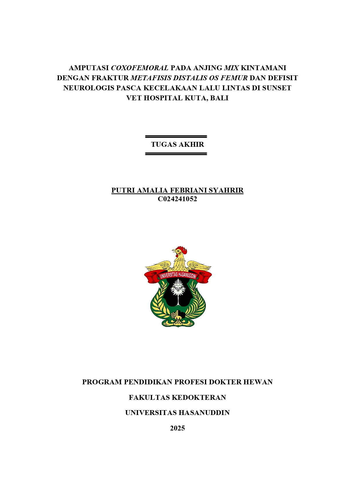 SYAHRIR, PUTRI AMALIA FEBRIANI (2025) Amputasi Coxofemoral pada Anjing Mix Kintamani dengan Fraktur Metafisis Distalis Os Femur dan Defisit Neurologis Pasca Kecelakaan Lalu Lintas Di Sunset Vet Hospital Kuta, Bali = Coxofemoral Amputation in a Mix Kintamani Dog With Distal Femoral Metaphyseal Fracture and Neurologic Deficits Following a Road Traffic Accident at Sunset Vet Hospital Kuta, Bali. Skripsi thesis, Universitas Hasanuddin.