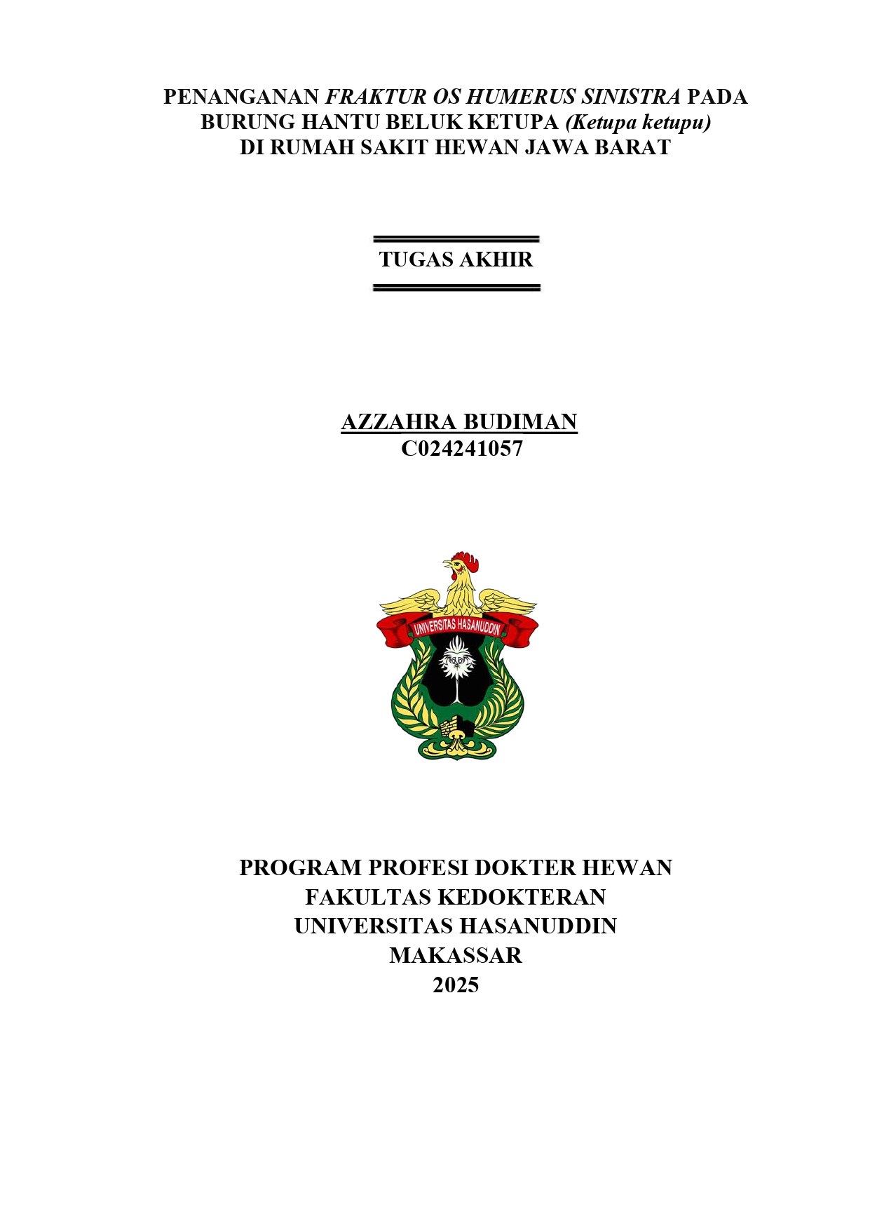 BUDIMAN, AZZAHRA (2028) Penanganan Fraktur Os Humerus Sinistra pada Burung Hantu Beluk Ketupa (Ketupa ketupu) di Rumah Sakit Hewan Jawa Barat = Clinical Management of a Sinistra Humeral Fracture in the Buffy Fish Owl (Ketupa ketupu) at the West Java Veterinary Hospital. Skripsi thesis, Universitas Hasanuddin.