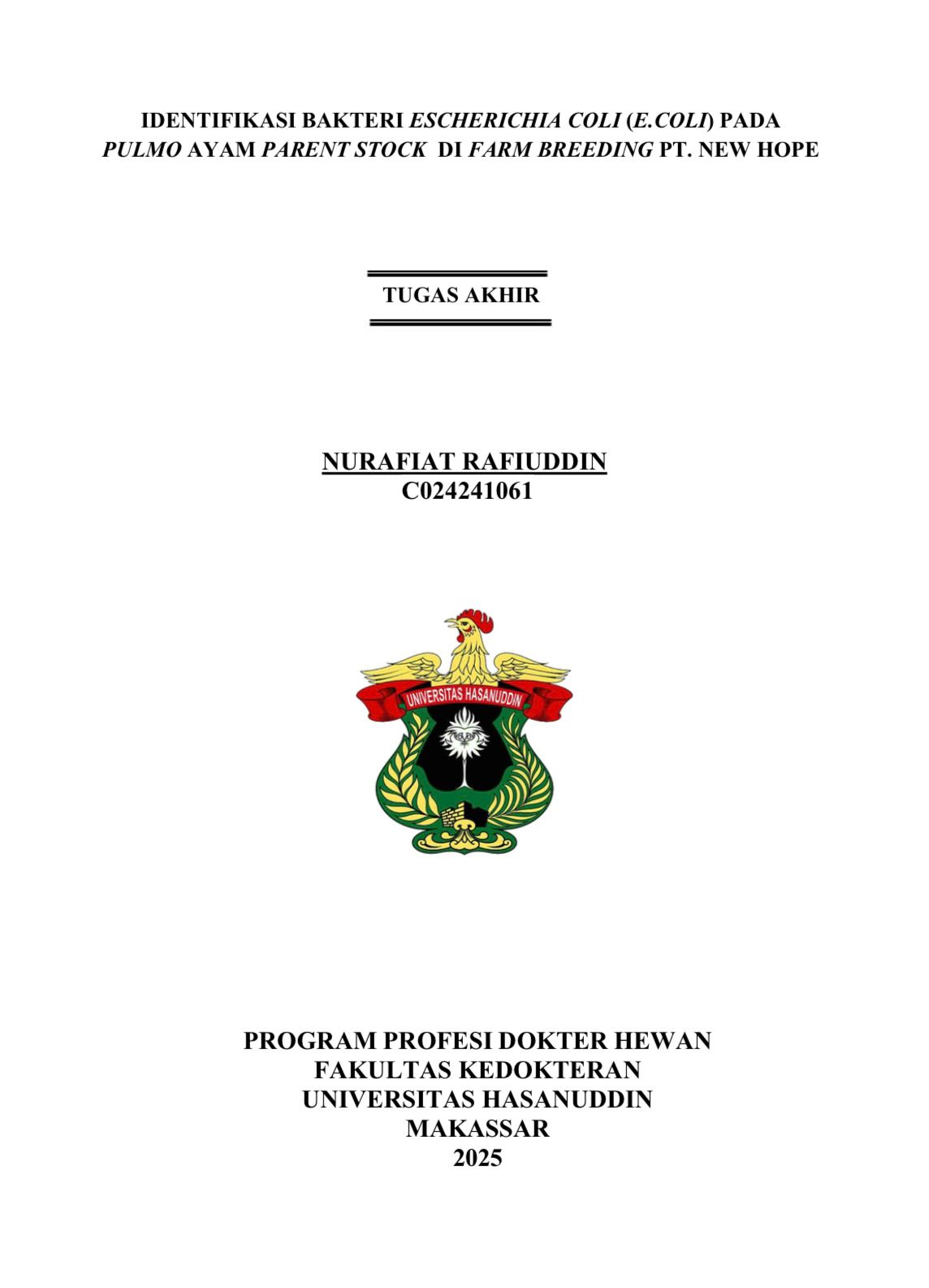 RAFIUDDIN, NURAFIAT (2026) Identifikasi Bakteri Escherichia coli (E.coli) pada Pulmo Ayam Parent Stock di Farm Breeding PT. New Hope = Identification of Bacteria Escherichia coli (E.coli) in the Lungs of Parent Stock Chicken at Farm Breeding PT. New Hope. Skripsi thesis, Universitas Hasanuddin.