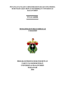 Urolithiasis merupakan salah satu penyebab utama gangguan saluran kemih bawah (Feline Lower Urinary Tract Disease/FLUTD) pada kucing yang ditandai dengan terbentuknya batu urolit di kandung kemih atau uretra. Penyakit ini dapat menimbulkan gejala seperti disuria, hematuria, stranguria, hingga obstruksi urin yang bersifat darurat. Laporan kasus tugas akhir ini bertujuan untuk mendeskripsikan penanganan urolithiasis pada seekor kucing Persia betina berumur dua tahun yang ditangani di Rumah Sakit Hewan Pendidikan Universitas Hasanuddin. Pemeriksaan dilakukan melalui anamnesis, pemeriksaan fisik, hematologi, urinalisis, ultrasonografi, pemeriksaan sedimen urin, serta kultur bakteri. Hasil pemeriksaan menunjukkan adanya dehidrasi, demam, hematuria, peningkatan granulosit, urolit pada kandung kemih, serta infeksi bakteri Escherichia coli. Penanganan dilakukan dengan terapi cairan intravena, antibiotik, antiinflamasi, obat penghancur batu urolit, suplementasi vitamin dan imun booster, serta diet khusus saluran kemih. Hasil evaluasi pascaterapi menunjukkan perbaikan kondisi klinis pasien, penurunan ukuran batu urolit, serta membaiknya kualitas urin. Penanganan yang tepat dan komprehensif terbukti efektif dalam memperbaiki kondisi klinis dan mencegah komplikasi lebih lanjut pada kasus urolithiasis