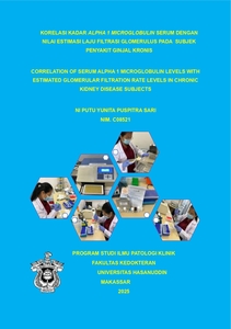 SARI, NI PUTU YUNITA PUSPITRA (2025) KORELASI KADAR ALPHA 1 MICROGLOBULIN SERUM DENGAN NILAI ESTIMASI LAJU FILTRASI GLOMERULUS PADA SUBJEK PENYAKIT GINJAL KRONIS = CORRELATION OF SERUM ALPHA 1 MICROGLOBULIN LEVELS WITH ESTIMATED GLOMERULAR FILTRATION RATE LEVELS IN CHRONIC KIDNEY DISEASE SUBJECTS. Thesis thesis, Universitas Hasanuddin.