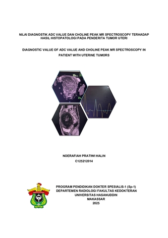 HALIN, NOERAFIAH PRATIWI (2025) NILAI DIAGNOSTIK ADC VALUE DAN CHOLINE PEAK MR SPECTROSCOPY TERHADAP HASIL HISTOPATOLOGI PADA PENDERITA TUMOR UTERI = DIAGNOSTIC VALUE OF ADC VALUE AND CHOLINE PEAK MR SPECTROSCOPY IN PATIENT WITH UTERINE TUMORS. Skripsi thesis, Universitas Hasanuddin.