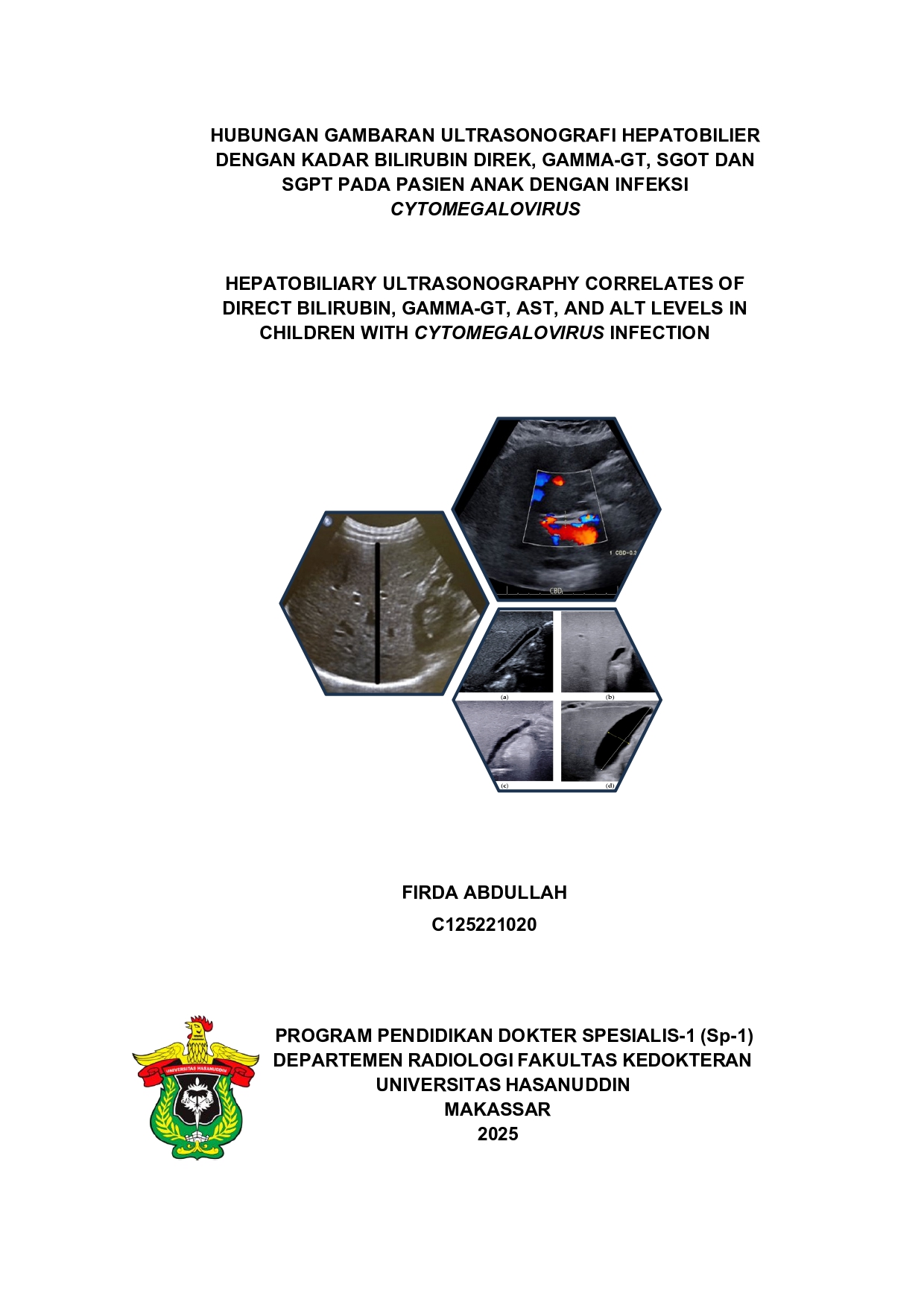 ABDULLAH, FIRDA (2025) HUBUNGAN GAMBARAN ULTRASONOGRAFI HEPATOBILIER DENGAN KADAR BILIRUBIN DIREK, GAMMA-GT, SGOT DAN SGPT PADA PASIEN ANAK DENGAN INFEKSI CYTOMEGALOVIRUS = HEPATOBILIARY ULTRASONOGRAPHY CORRELATES OF DIRECT BILIRUBIN, GAMMA-GT, AST, AND ALT LEVELS IN CHILDREN WITH CYTOMEGALOVIRUS INFECTION. Skripsi thesis, Universitas Hasanuddin.