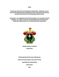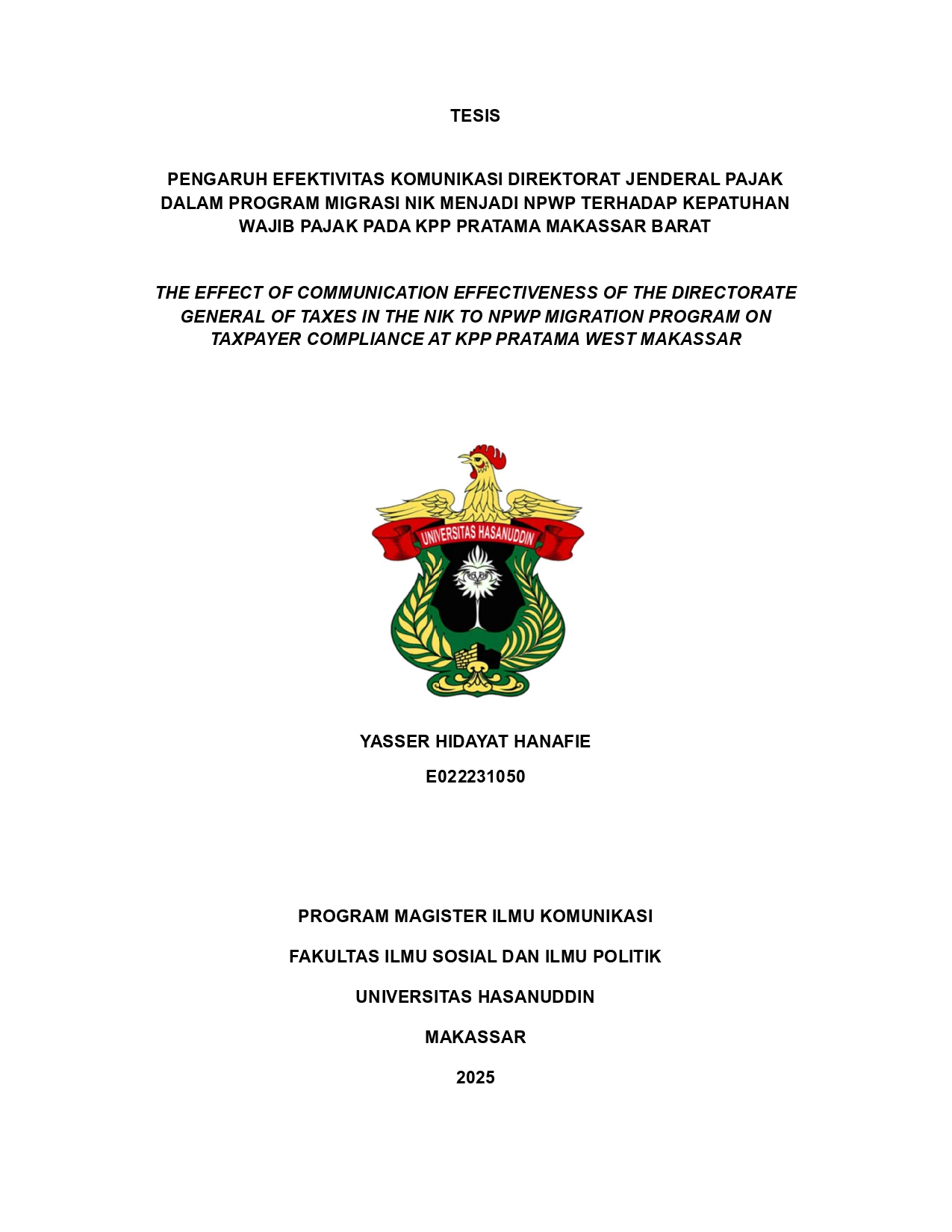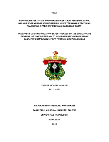 HANAFIE, YASSER HIDAYAT (2025) PENGARUH EFEKTIVITAS KOMUNIKASI DIREKTORAT JENDERAL PAJAK DALAM PROGRAM MIGRASI NIK MENJADI NPWP TERHADAP KEPATUHAN WAJIB PAJAK PADA KPP PRATAMA MAKASSAR BARAT = THE EFFECT OF COMMUNICATION EFFECTIVENESS OF THE DIRECTORATE GENERAL OF TAXES IN THE NIK TO NPWP MIGRATION PROGRAM ON TAXPAYER COMPLIANCE AT KPP PRATAMA WEST MAKASSAR. Thesis thesis, Universitas Hasanuddin.