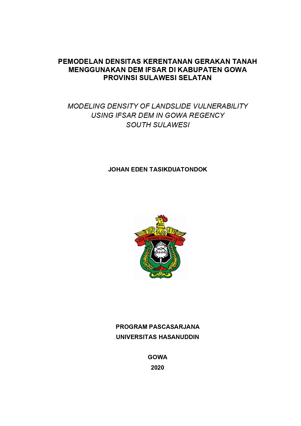 TASIKDUATONDOK, JOHAN EDEN (2020) PEMODELAN DENSITAS KERENTANAN GERAKAN TANAH MENGGUNAKAN DEM IFSAR DI KABUPATEN GOWA PROVINSI SULAWESI SELATAN. Thesis thesis, Universitas Hasanuddin.